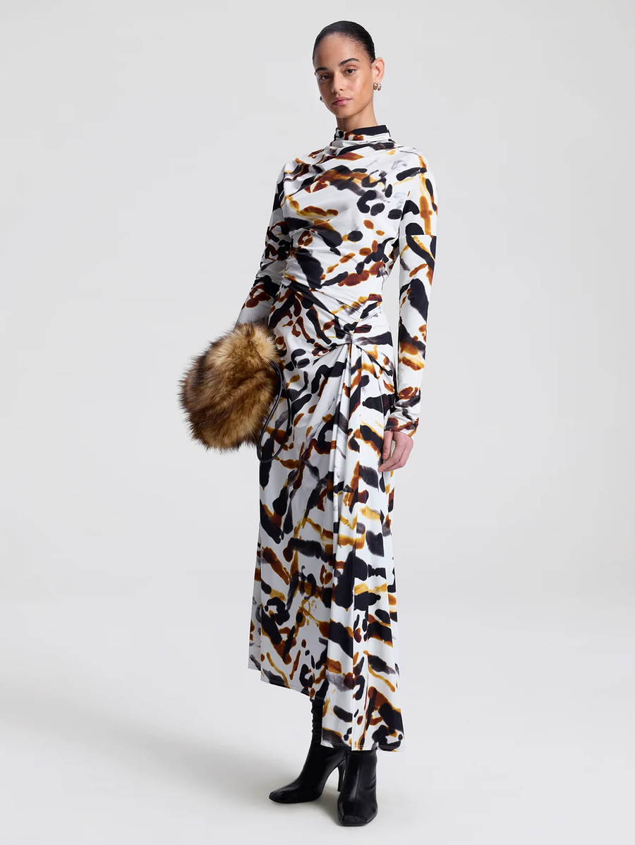 Amy Says... Rendered in soft viscose jersey with a hand-painted abstract print, this maxi dress is defined by a high cowl neck, draped silhouette, hip ruching, and an asymmetric hem. Shop Dresses.