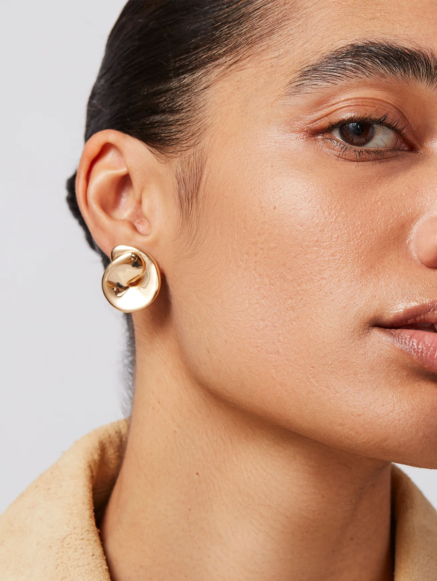 Amy Says... A modern take on vintage button earrings, starring twisting luminous metal. Simple yet effective, the rounded design folds over itself, creating an envelope effect. Finished in high-polish 14k gold. Shop Jewelry.