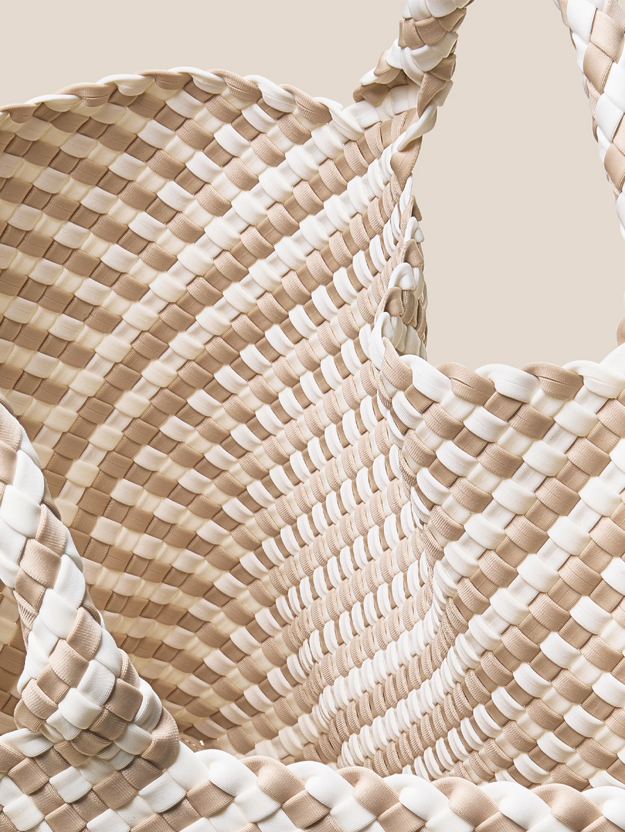 Amy Says... Handwoven neoprene in Ecru and Jasmine The St. Barths Large Tote is a lightweight and versatile classic, ideal for travel and the beach. Elevate your look with this spacious, chic accessory that blends luxury and functionality for modern elegance.