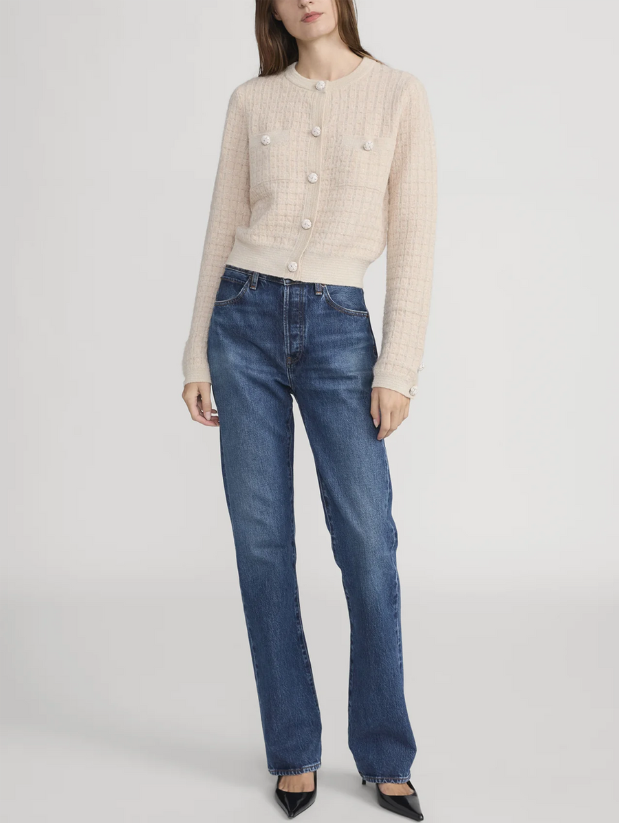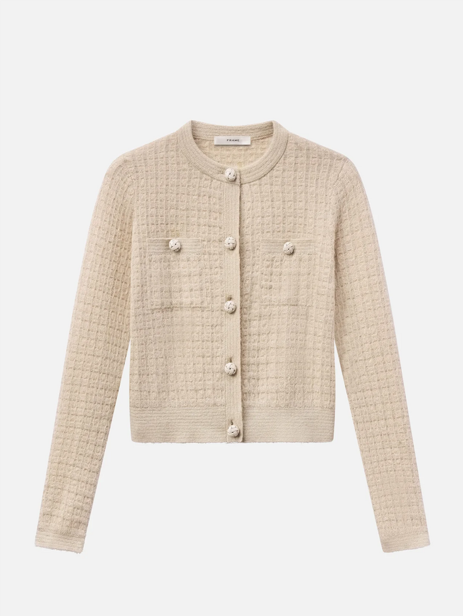 Amy Says... A modern take on a preppy classic, knit from a fine baby alpaca blend yarn. The Lurex Check Cardi features double front pockets and a lurex check pattern for texture and dimension. Finished with delicate, feminine, white braided buttons. Endlessly versatile, style it with your favorite denim for an everyday look, or over a maxi skirt for a more feminine feel. Shop Sweaters.