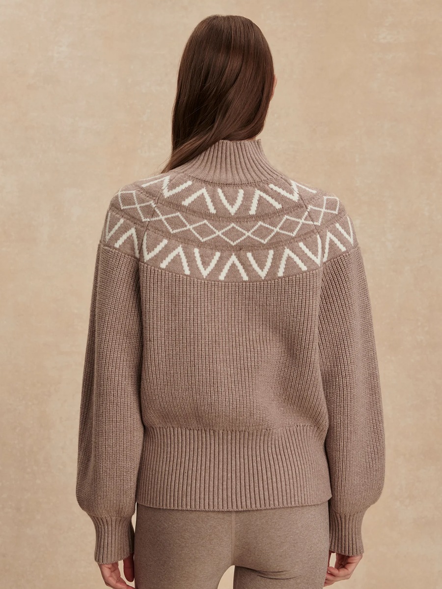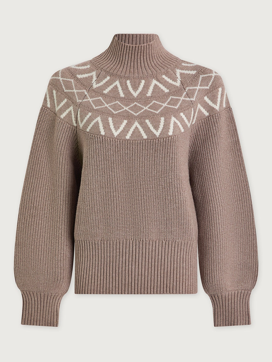 Amy Says... Elevate your winter wardrobe with our Marcie sweater – statement warmth for on and off the mountains. This piece boasts a relaxed fit, turtleneck, and chic balloon sleeves, complemented by an intricate all-over ribbed design and contemporary V monogram Fair Isle yoke. Complete the look by pairing the sweater with our matching beanie for an effortlessly stylish ensemble. Shop Sweaters.