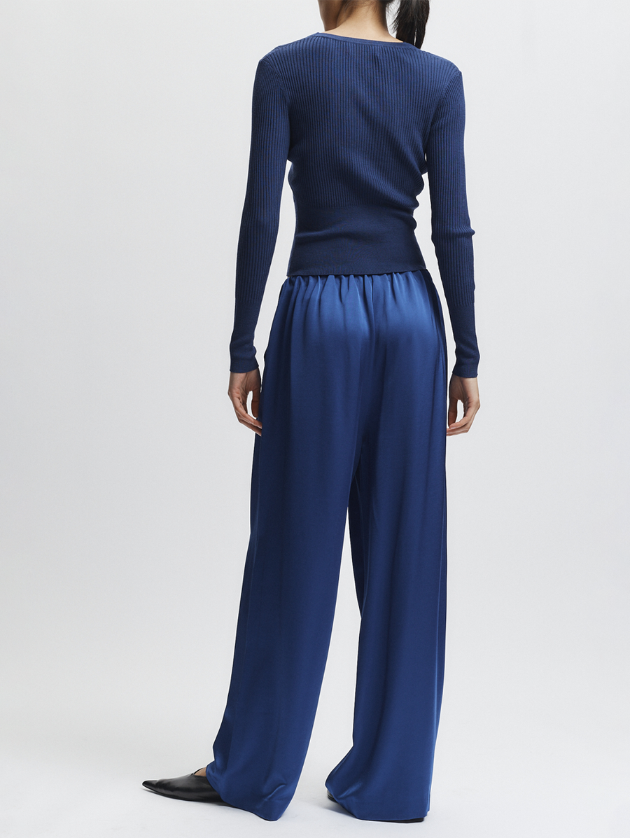Amy Says... Introducing the Paige Pull-On Pant in Navy. Made from signature wrinkle-resistant charmeuse fabric, these pants are both comfortable and elevated with ruched detailing at the waist. Perfect for day to evening wear and travel, these machine washable pants are a bestseller. Upgrade your wardrobe with ease and style. Shop Trousers.