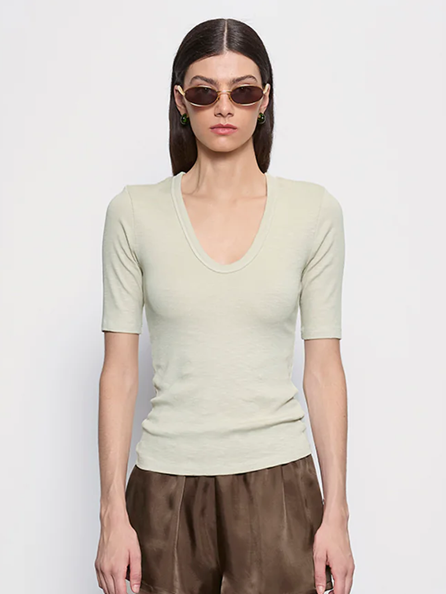 Enza Costa has a way of making the simplest silhouette feel like the right one. The textured rib knit gives this top a tactile quality that a smooth jersey just does not have. A U-neckline and half sleeve make it versatile enough to wear three months in a row without once feeling bored by it. -