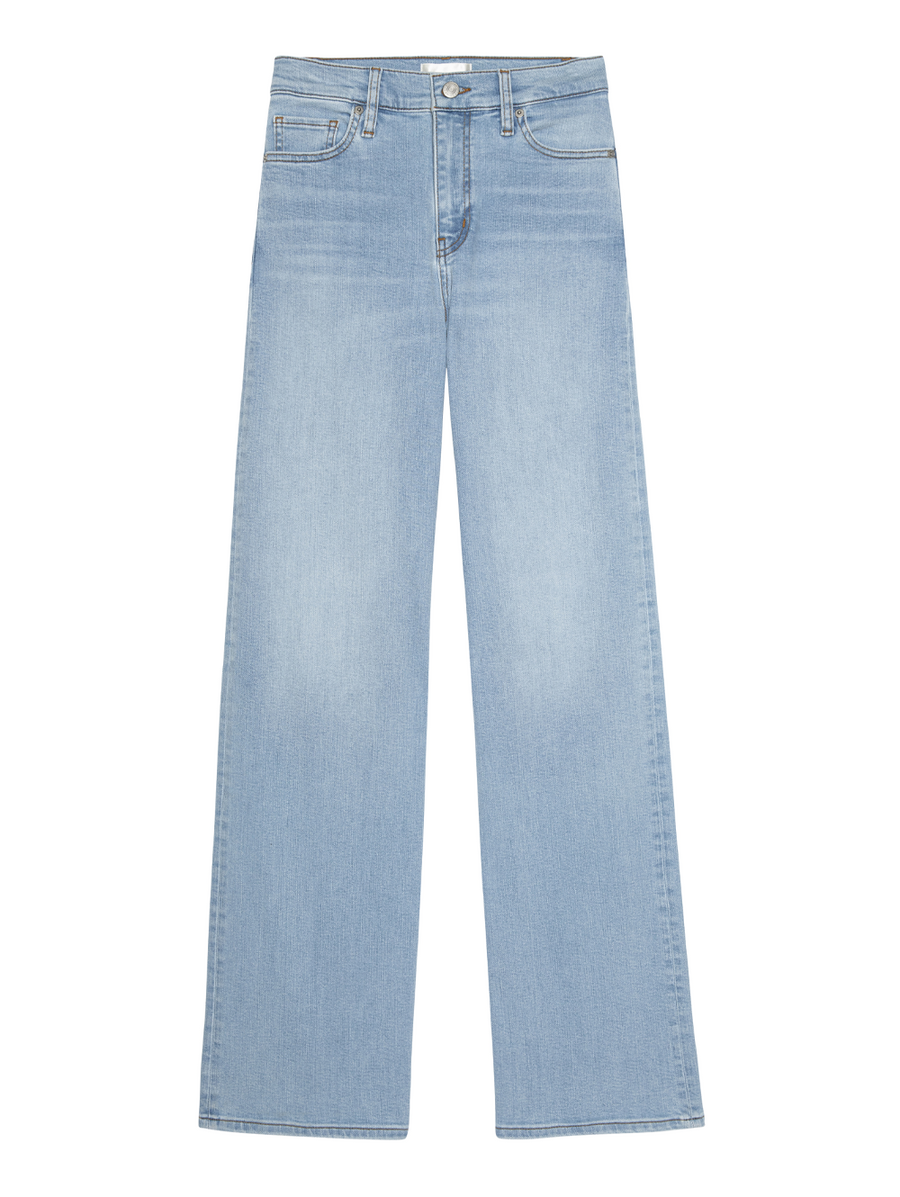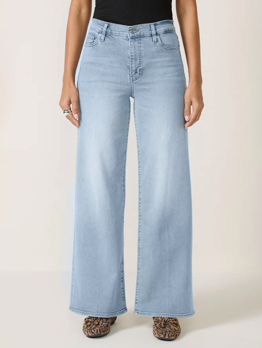 The high-rise palazzo cut does two things at once — it creates a long, clean line from waist to floor while the stretch keeps it comfortable enough to actually wear all day. The light wash is the version that works in every season without announcing itself. -