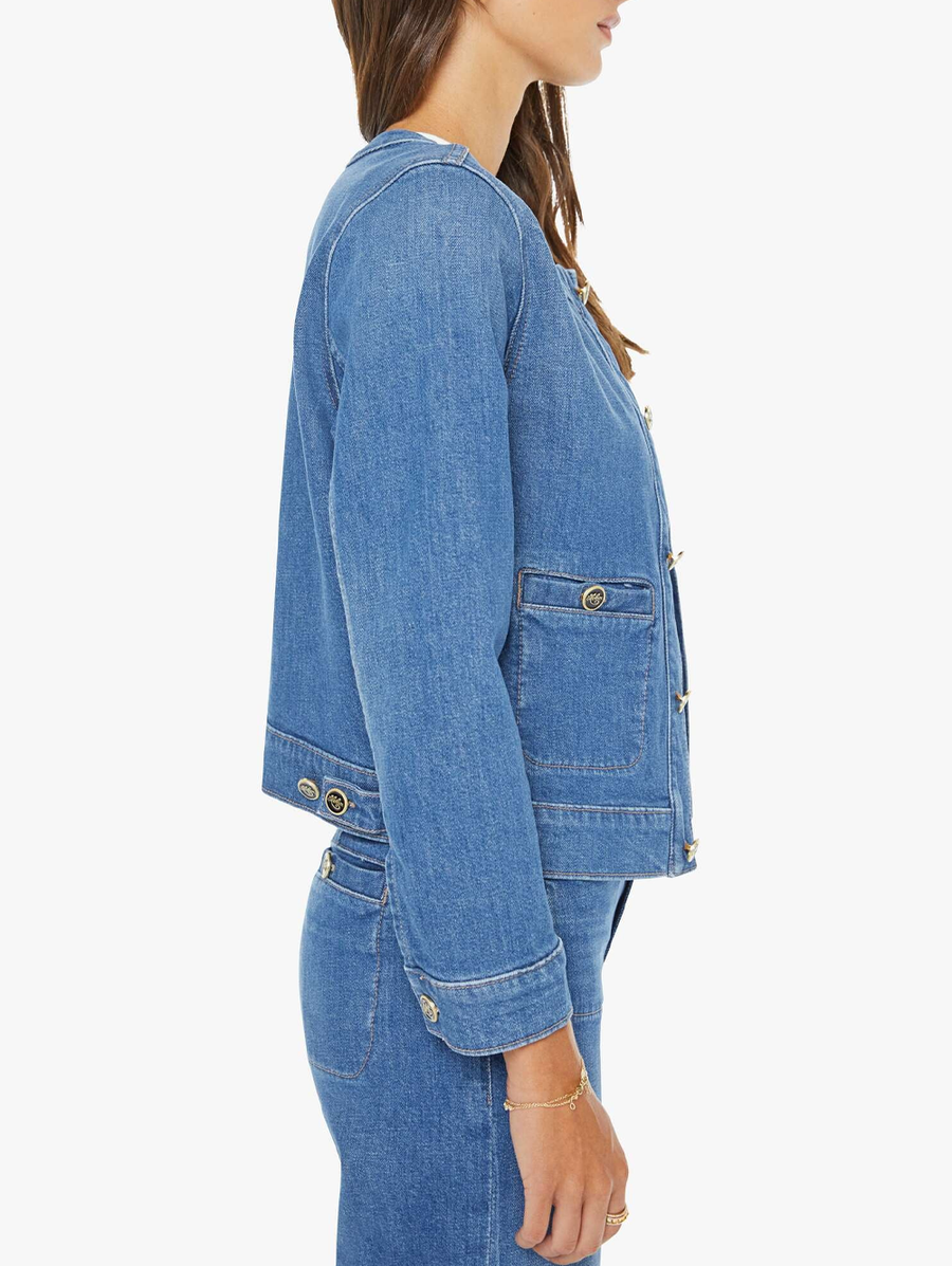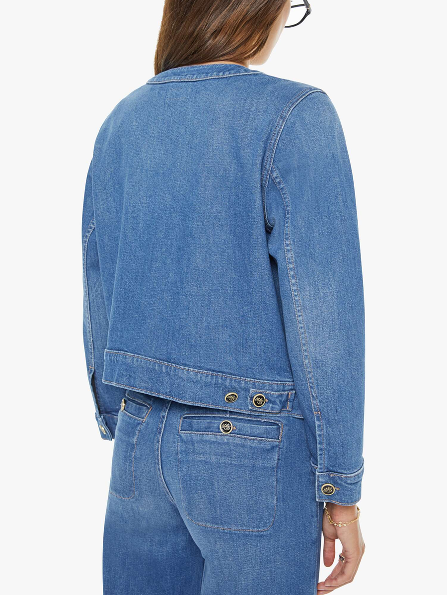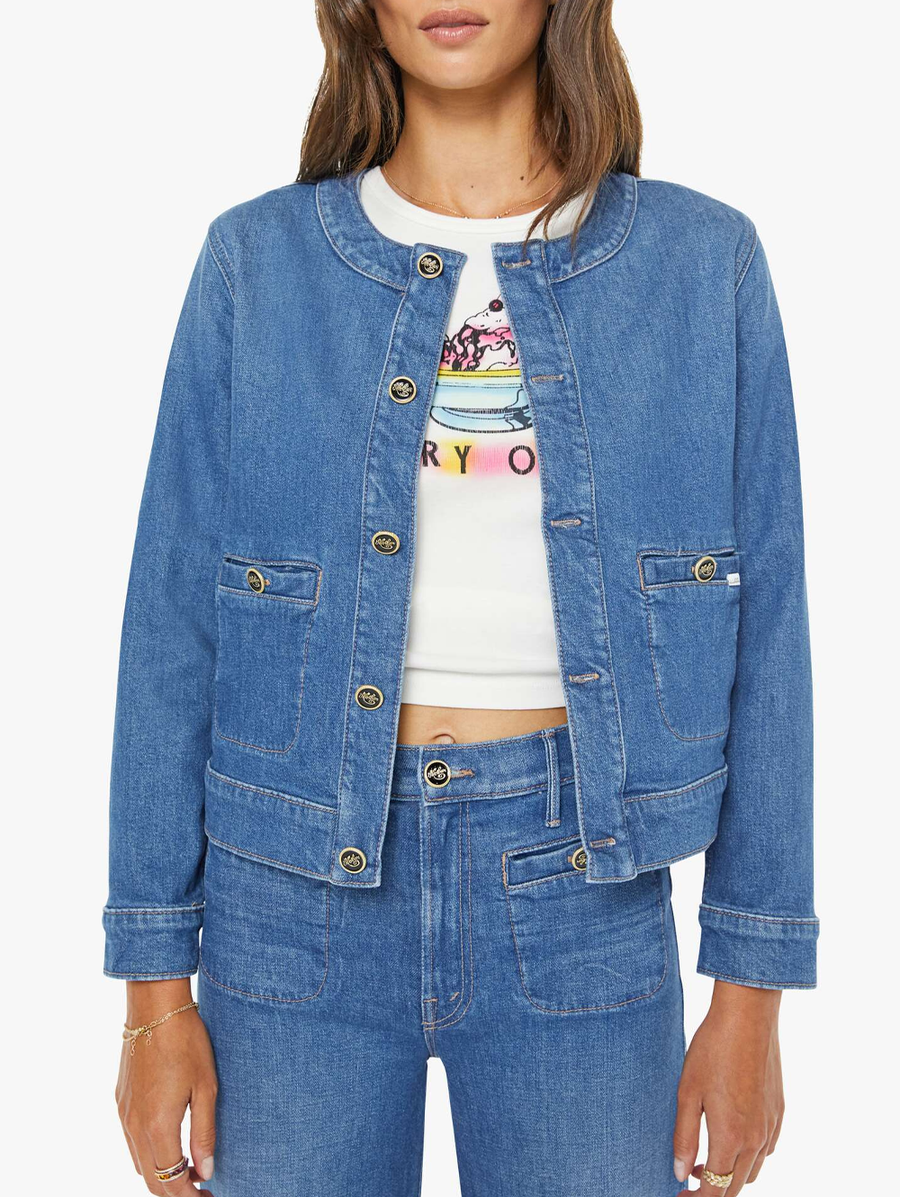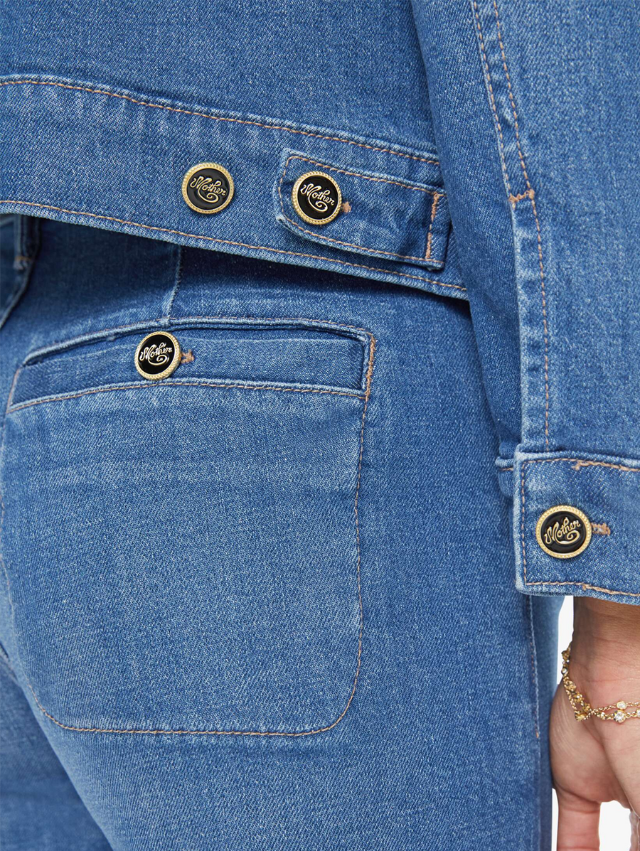 MOTHER built this from a recycled stretch denim blend that moves with you instead of fighting you. The patch pockets and enamel buttons are small decisions that add up to something that feels considered rather than basic. This is the jacket you throw on without thinking and it makes the whole look. -