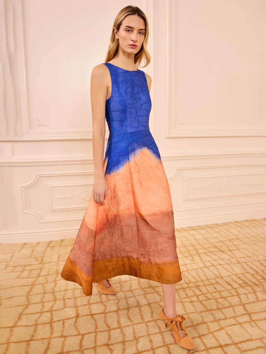 Amy Says... The Georgia Dress breathes with imagery from Helen Frankenthaler’s 1968 painting, “Moontide,” its mystical, watery hues saturated across Italian crinkled satin. This occasion-ready, multicolored dress has a timeless bateau neckline that turns to reveal an open back. Shop Dresses.