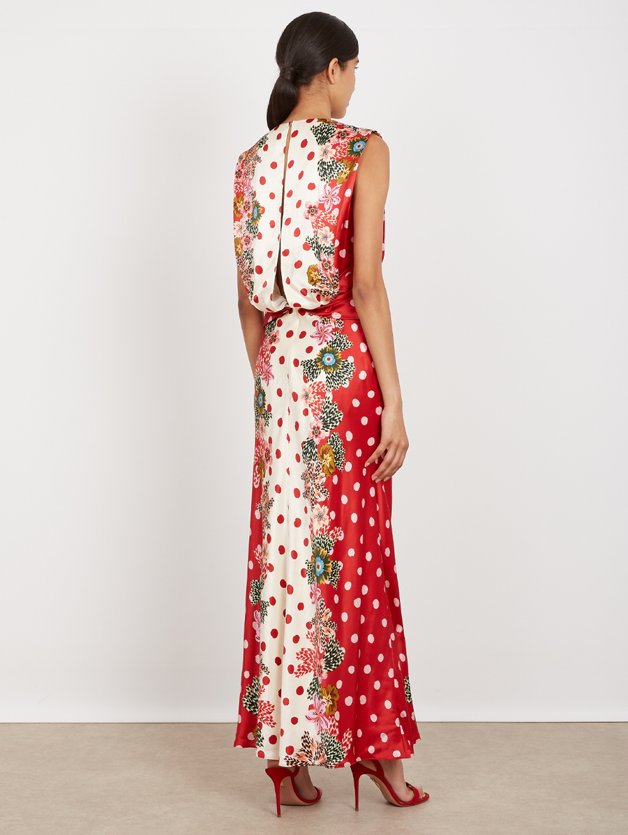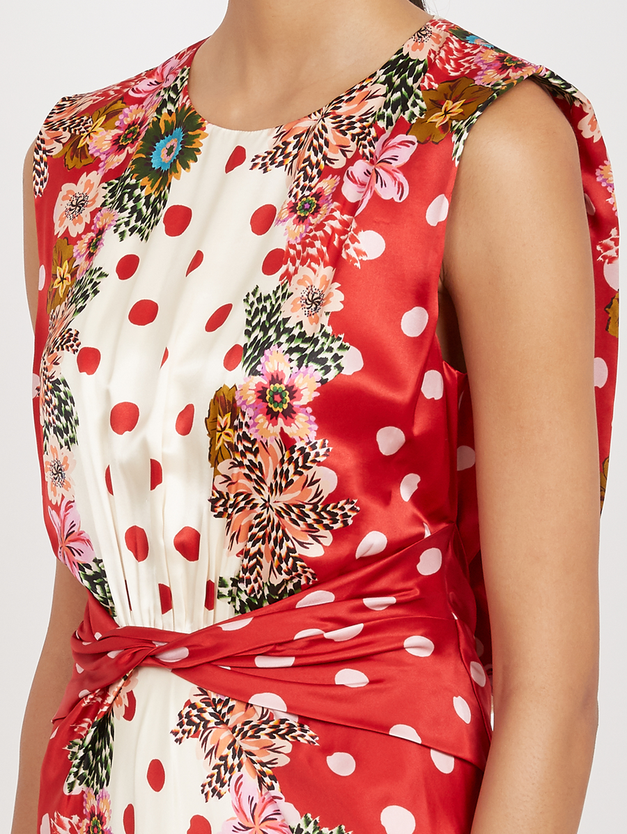 Amy Says... The Gwen Dress offers a unique proposition for instinctive sophistication. Its sleeveless design features a beautifully twisted detail at the bodice and soft gathers at the waist, creating a flattering silhouette. Its bias-cut skirt flows with graceful movement, while a papercut mosaic print of blossoms unfolds across a bold red and ivory polka dot ground, adding depth and artistry. Perfect for parties and weddings, this is a captivating choice for celebrating life’s most memorable moments. Shop Dresses.