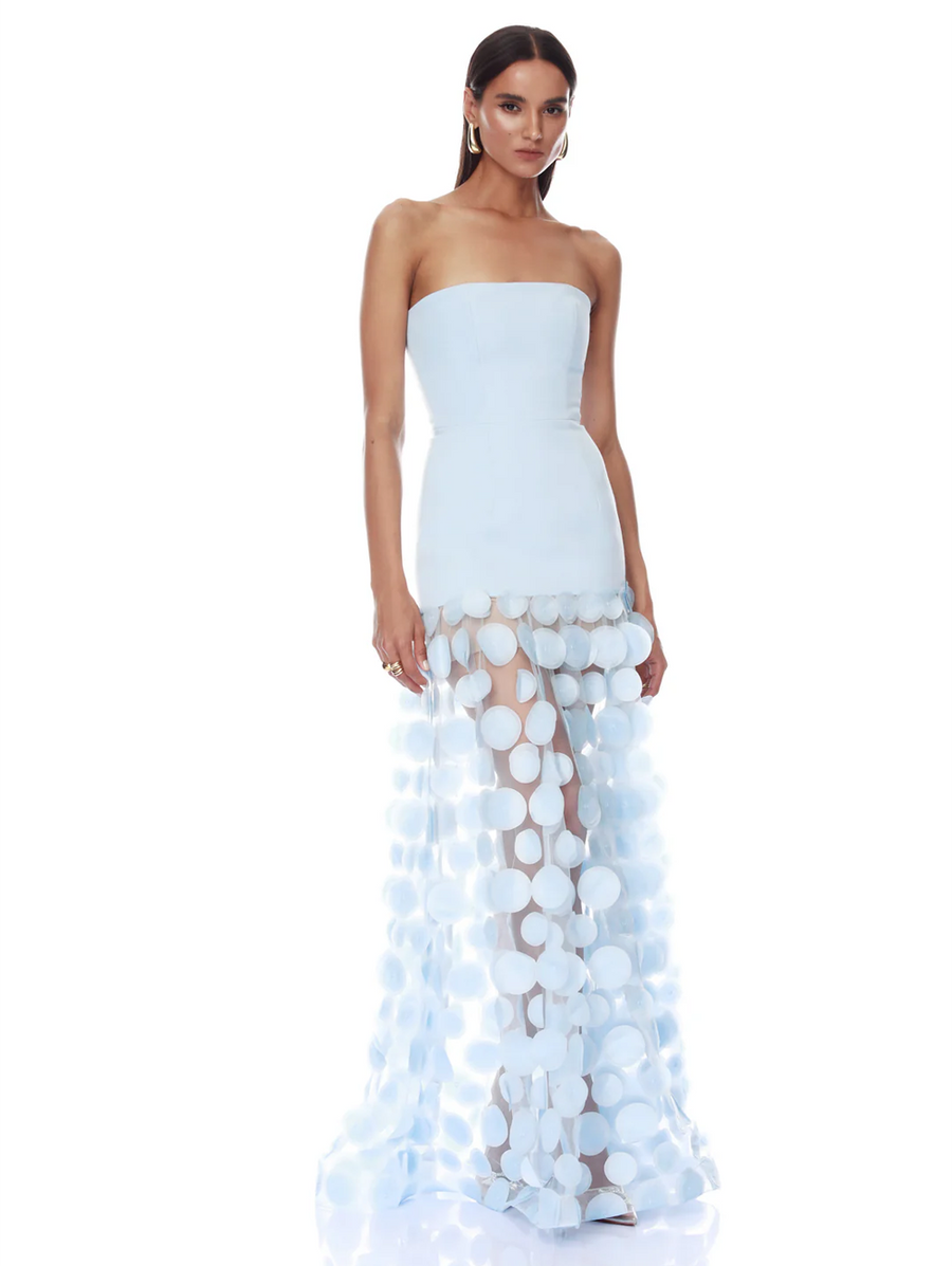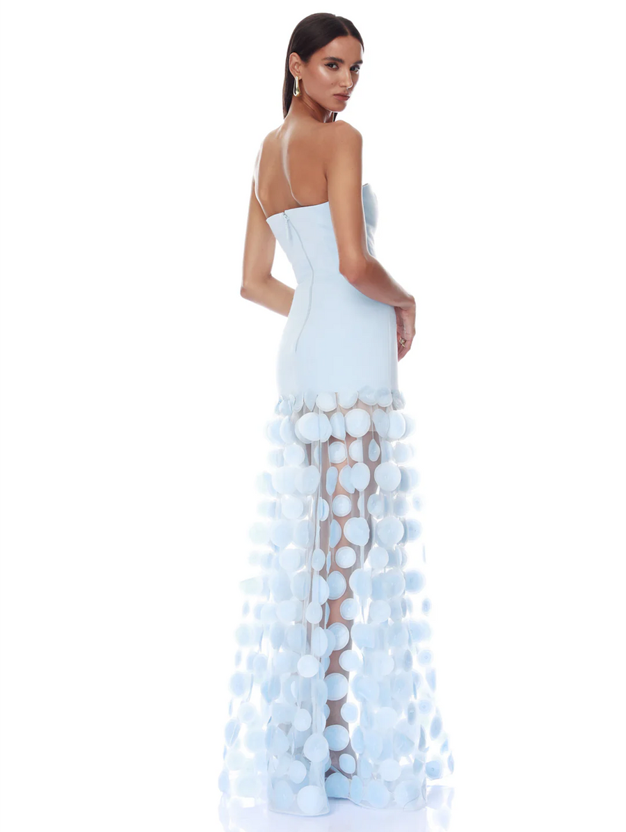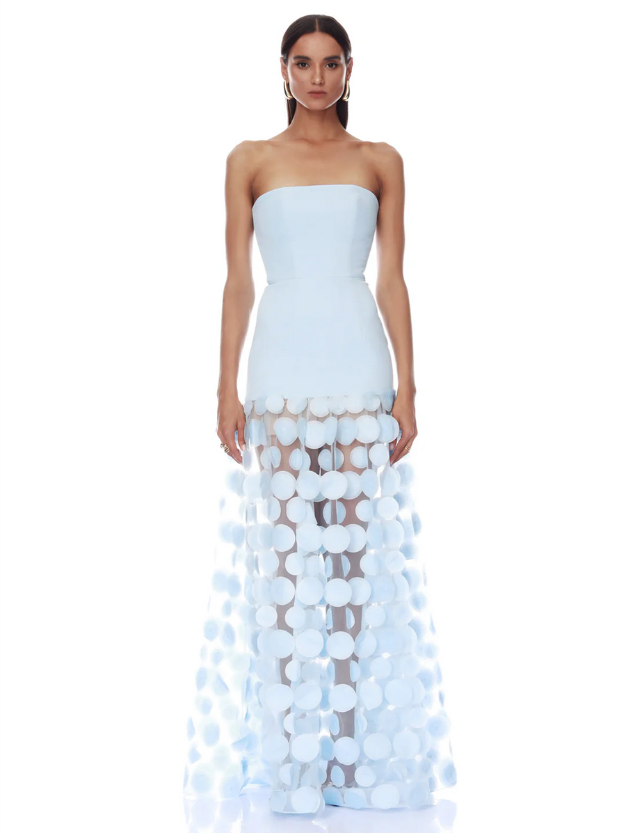 Amy Says... Embody classic elegance in the Harper Strapless Powder Blue Gown, featuring a fitted dropped waist bodice paired with a voluminous mesh skirt adorned with circle appliqués for an unforgettable evening look. Shop Dresses.