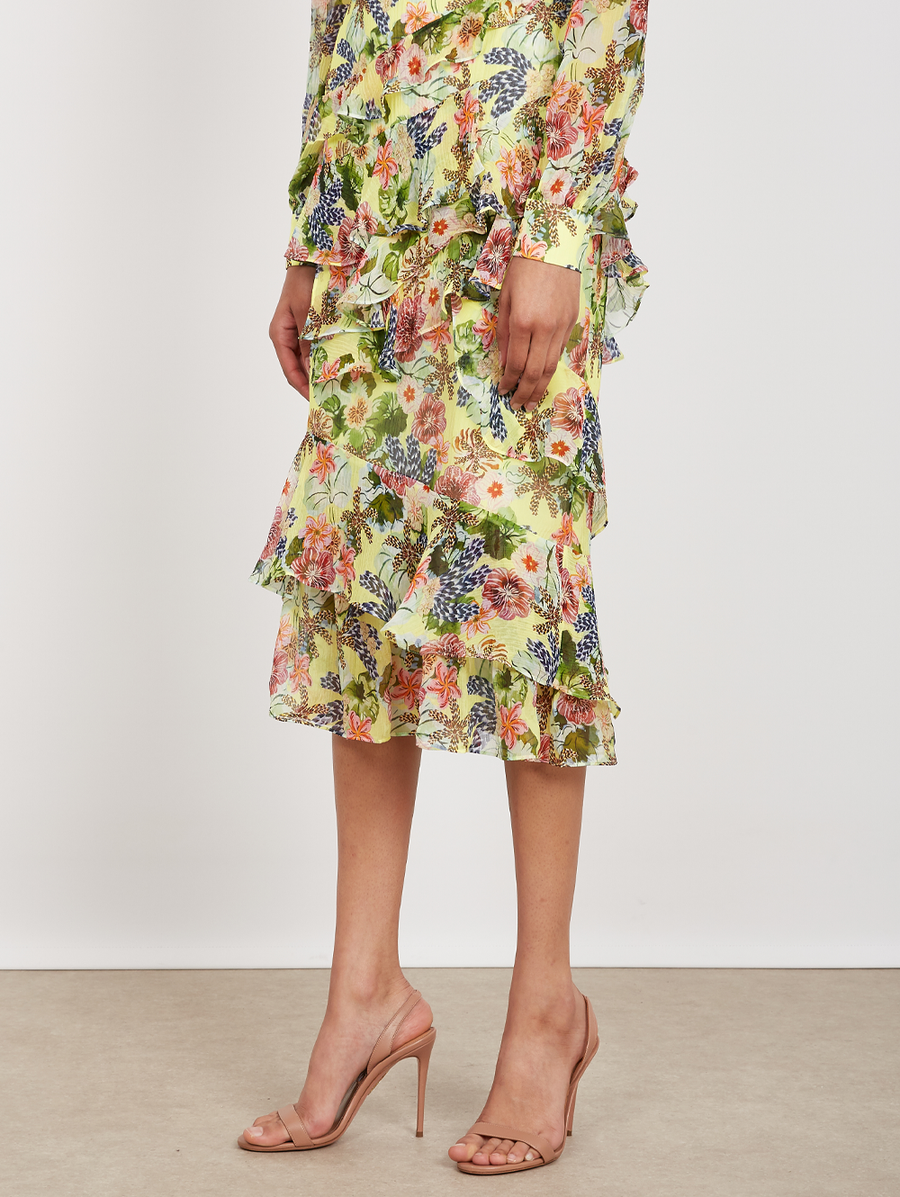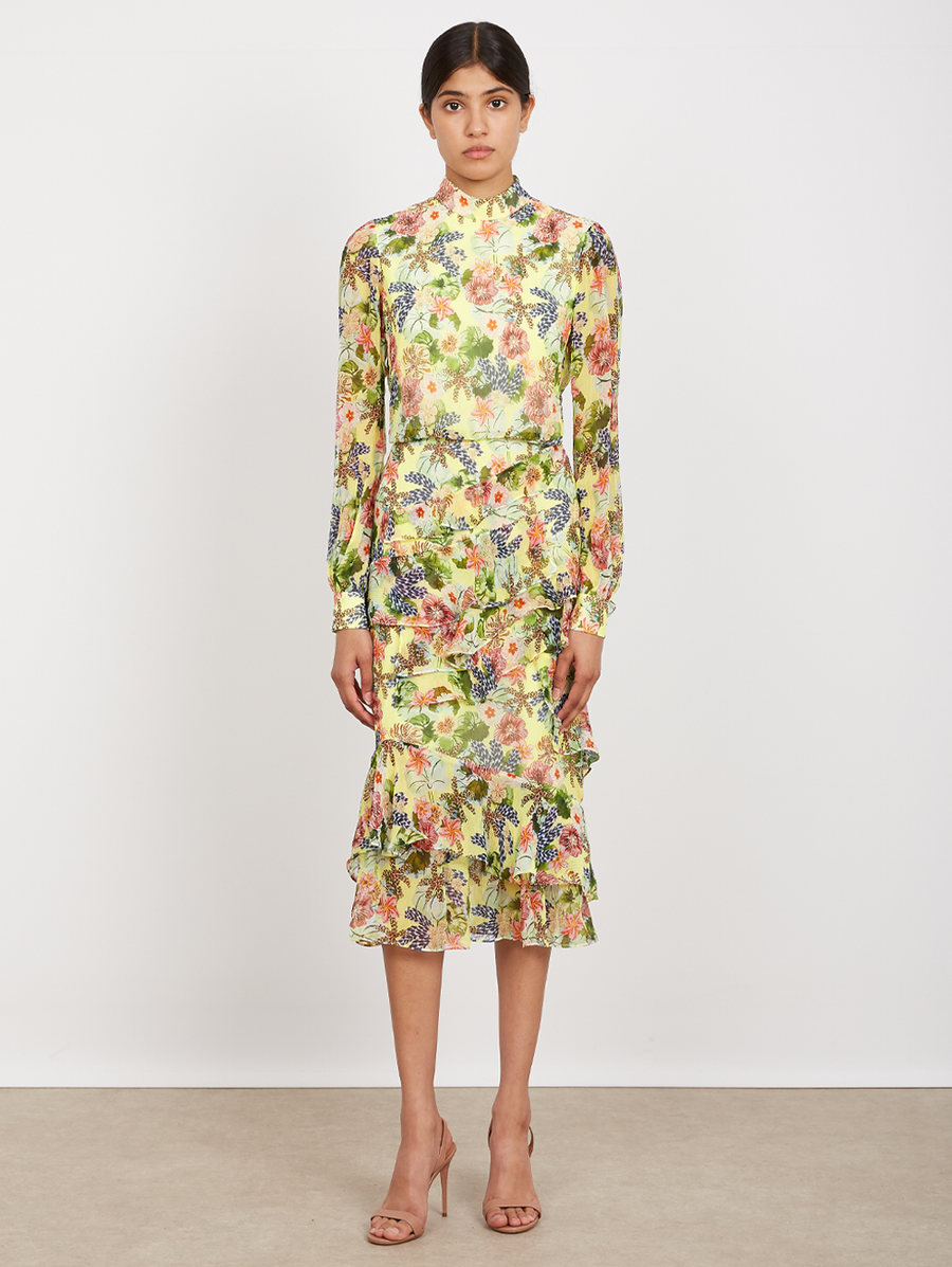 Amy Says... The Isa Ruffle Dress, reimagined this season in a stunning Plumeria Lemon, blends timeless charm with modern elegance. Made from chiffon, this midi-length dress features a stylish neckband, gently puffed long sleeves, and a soft blouson bodice that highlights the waist. An asymmetrical frill at the hem adds playful movement, while delicately patterned floral clusters against a pale yellow backdrop create a captivating statement piece. Shop Dresses.
