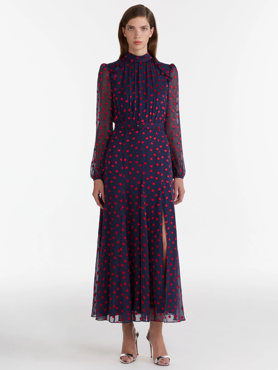 Amy Says... The Jacqui B Dress with its statement silhouette is reinvented in a devore rouge polka dot on a luminous navy ground. It features a fitted waist and flowing skirt, with a daring thigh-high split that creates a silhouette that moves beautifully with every step. This dress embodies SALONI's philosophy of effortless elegance for any occasion, making it perfect for both day and evening events. Shop Dresses.