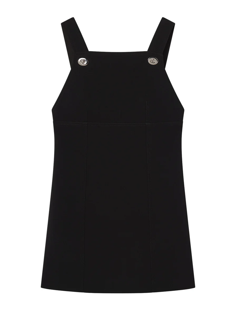 Amy Says... An apron-style mini dress cut from woven fabric with structured yet fluid drape, finished with silver turnlock straps and exposed front stitching. For additional room at the bust, we suggest taking the next size up. Shop Dresses.