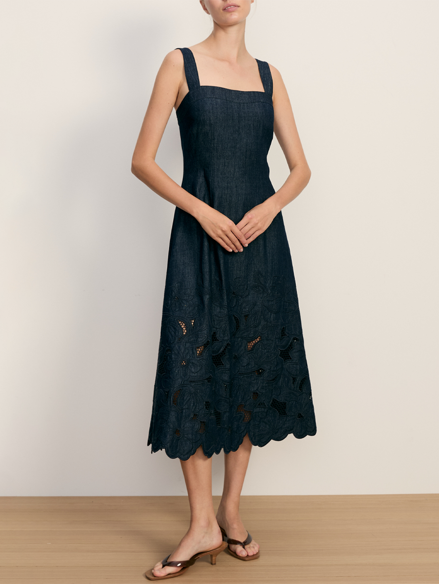 Amy Says... The ultimate throw-on-and-go style that delivers on both polish and ease. Expertly tailored from premium cotton chambray with eyelet panels and a feminine petal-scalloped hem. Fitted at the waist, it skims the body and finishes with a slight release at the hip. Dress it down or dress it up, it's a perfect day-to-night dress—and great for getaways. Shop Dresses.