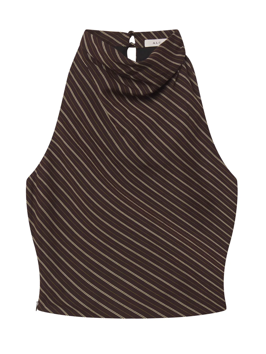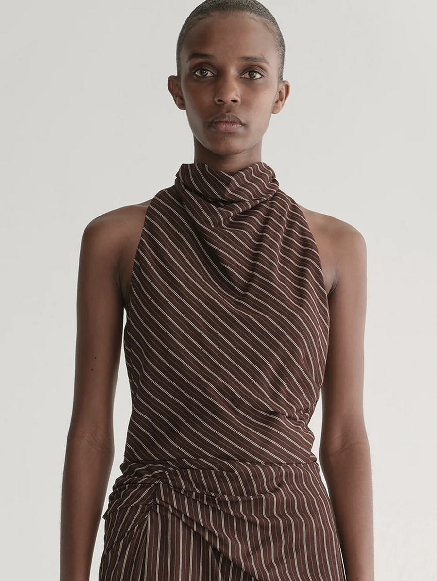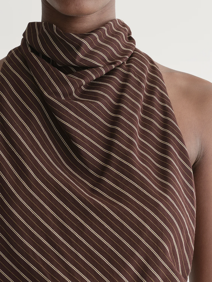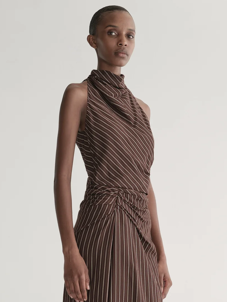 Amy Says... The Lillian Top is crafted from barre stripe shirting in a ganache-brown palette, cut with a fluid halter neckline and angled stripes that contour the body. A back keyhole finishes the look—pair with the coordinated Jean Skirt for a streamlined set. Shop Tops.