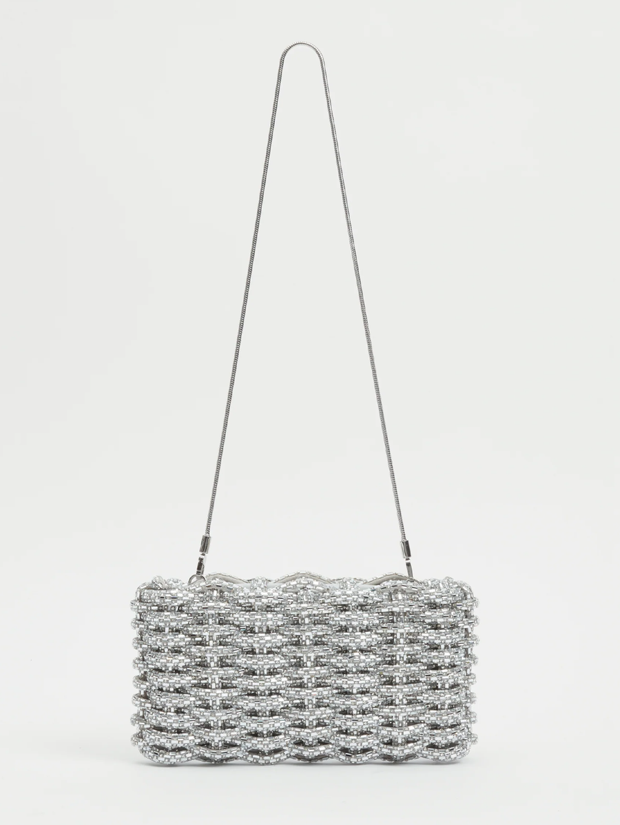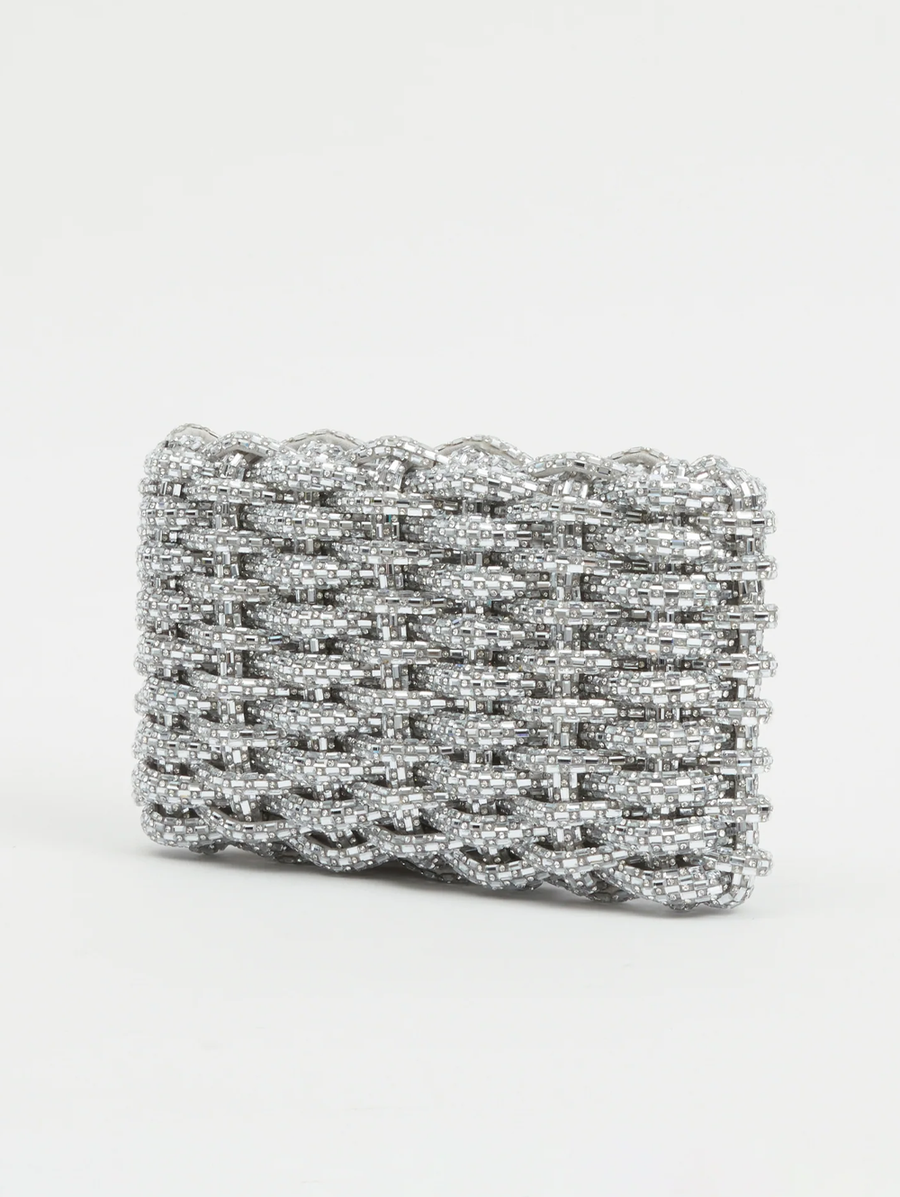 Amy Says... A structured clutch handwoven with rhinestones, with a removable chain strap. Compact and reflective—ideal for evening dressing. Shop Bags.