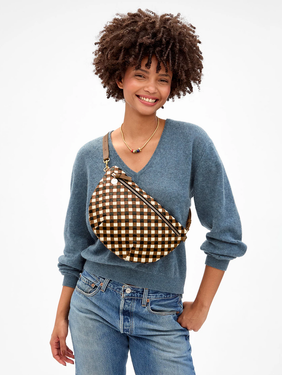 Amy Says... The big sister to Clare V.'s classic fanny pack, the Grande Fanny is wardrobe must-have. The perfect, hands-free bag to carry your essentials to the farmer's market, brunch, downtown and on vacation! Wear it around your waist, across your body, or hung from a shoulder-the choice is yours! Woven entirely by hand, this leather belt bag's slim profile offers surprising capacity while the detachable / adjustable / interchangeable strap keeps the style flexible. Shop Bags.