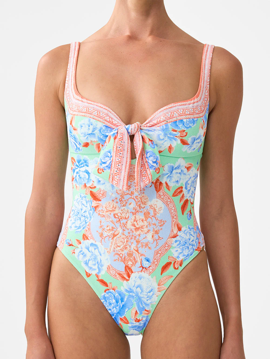 Amy Says... The Topkapi Pop Sweetheart Neck One Piece With Tie Front is a handcrafted silhouette designed by our in house artisans. Reimagined in an exclusive limited edition print, this textured towelling inspired one piece is made for C to D cups in mind with soft removable cups and adjustable straps for versatility. Features soft ties at the front, framed by a sweetheart neckline and finished with crystal embellishment for luminous detail.