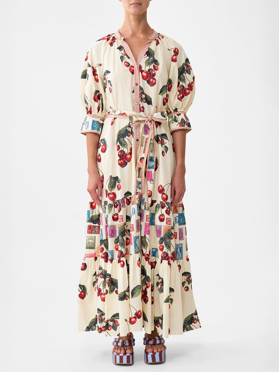 Amy Says... The Notes From The Road Tiered Shirt Dress With Short Sleeves is a handcrafted cotton silhouette designed by our in house artisans. Reimagined in an exclusive limited edition print, this full length maxi dress is adorned with feminine blouson sleeves, tapered with detailed cuffs and finished with a flattering button through front.