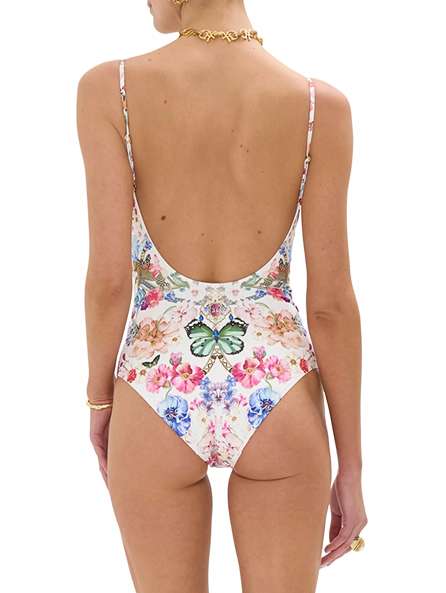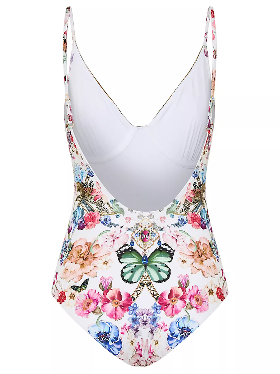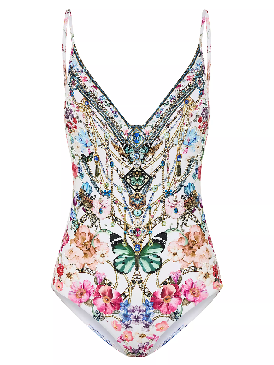 Amy Says... This Camilla one-piece swimsuit is adorned with an intricate floral motif with signature printed necklace-inspired details. The V-neckline features wiring for added structure while the spaghetti straps are adjustable.