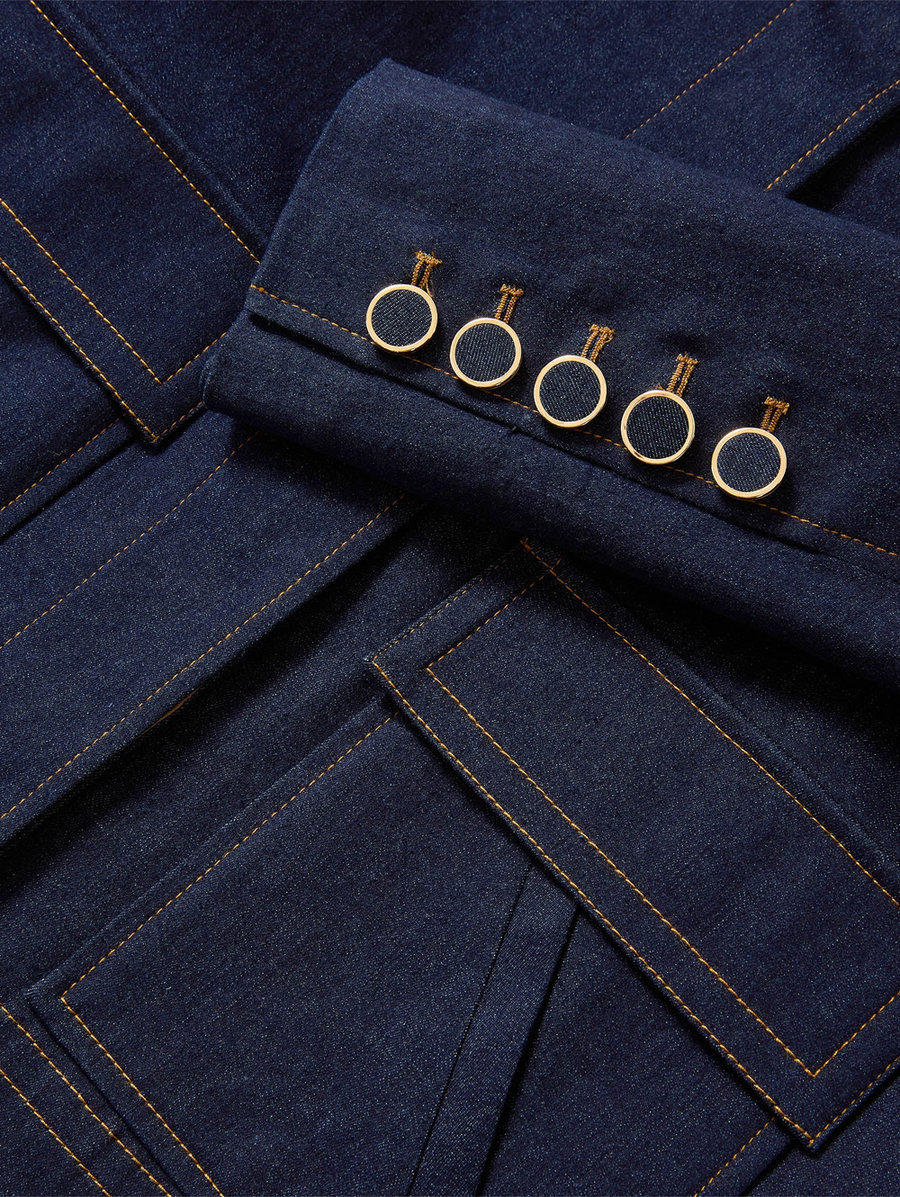 Amy Says... The denim jacket, refined with a hint of glamour. Crafted from our signature Stretch Denim Tailoring in dark-wash blue, the Barrington features a boxy, cropped silhouette and a luxe, crystal-embellished collar—removable for styling versatility. A single-button closure accents the clean, hidden placket, while oversized flap pockets add utilitarian edge. A chic layer to complete any look, it pairs well with matching dark-wash denim and tailored bottoms alike. Shop Jackets.