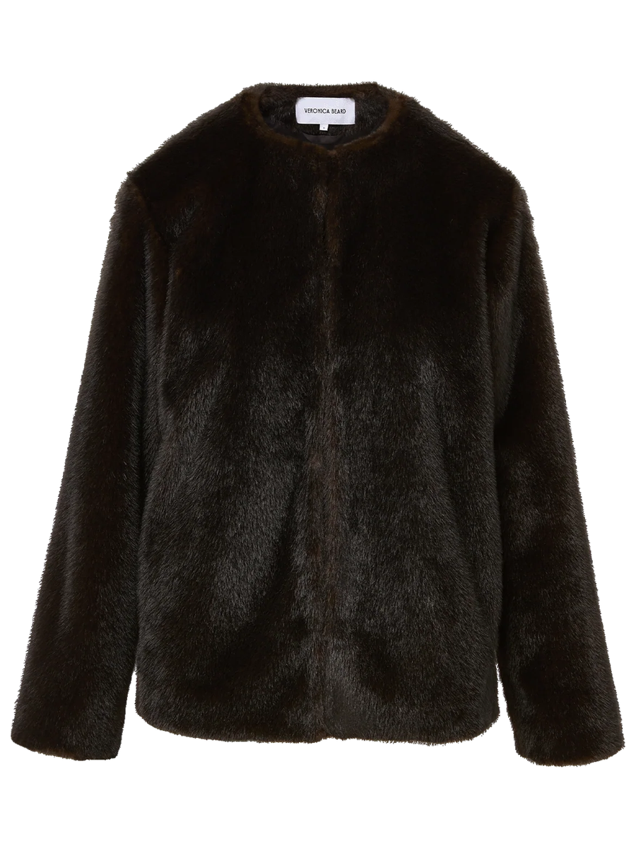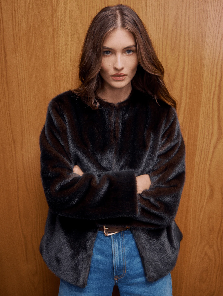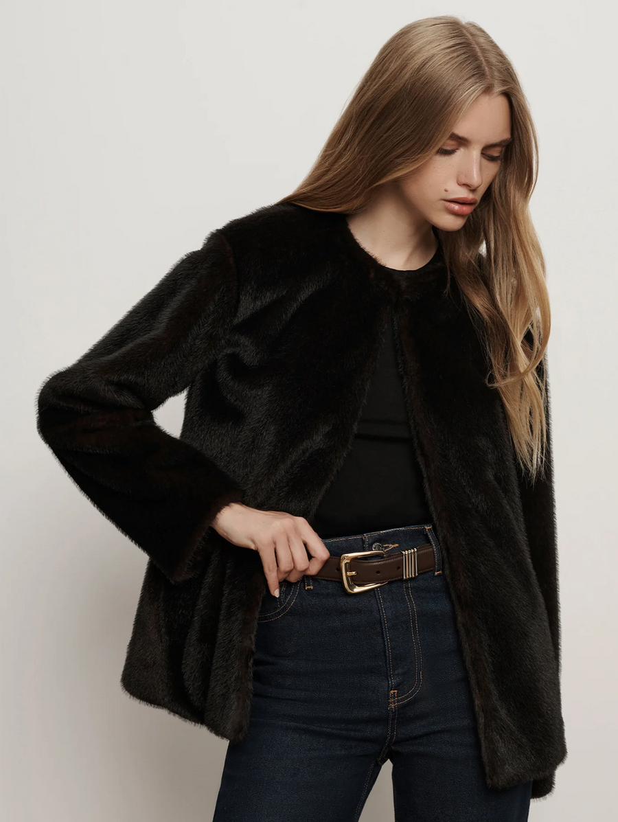 Amy Says... An elegant top layer to elevate any cold-weather look. Crafted from luxurious faux fur in rich brown, the Griselda features a boxy, collarless silhouette with dropped shoulders and a cropped hem, for a more relaxed and modern feel. Finished with a hidden hook-and-eye closure for a clean, streamlined effect, it's a chic layer you'll reach for all season long. Shop Coats.