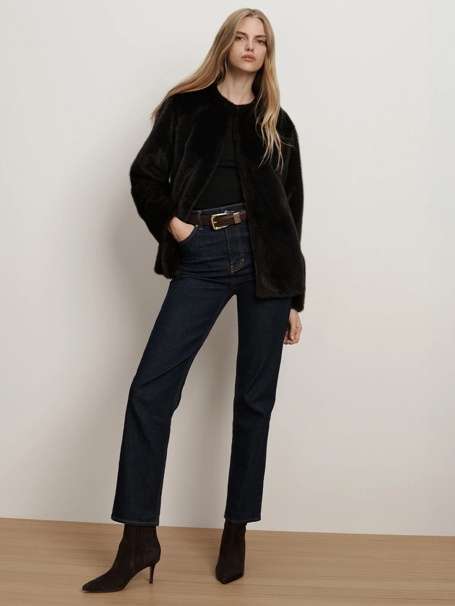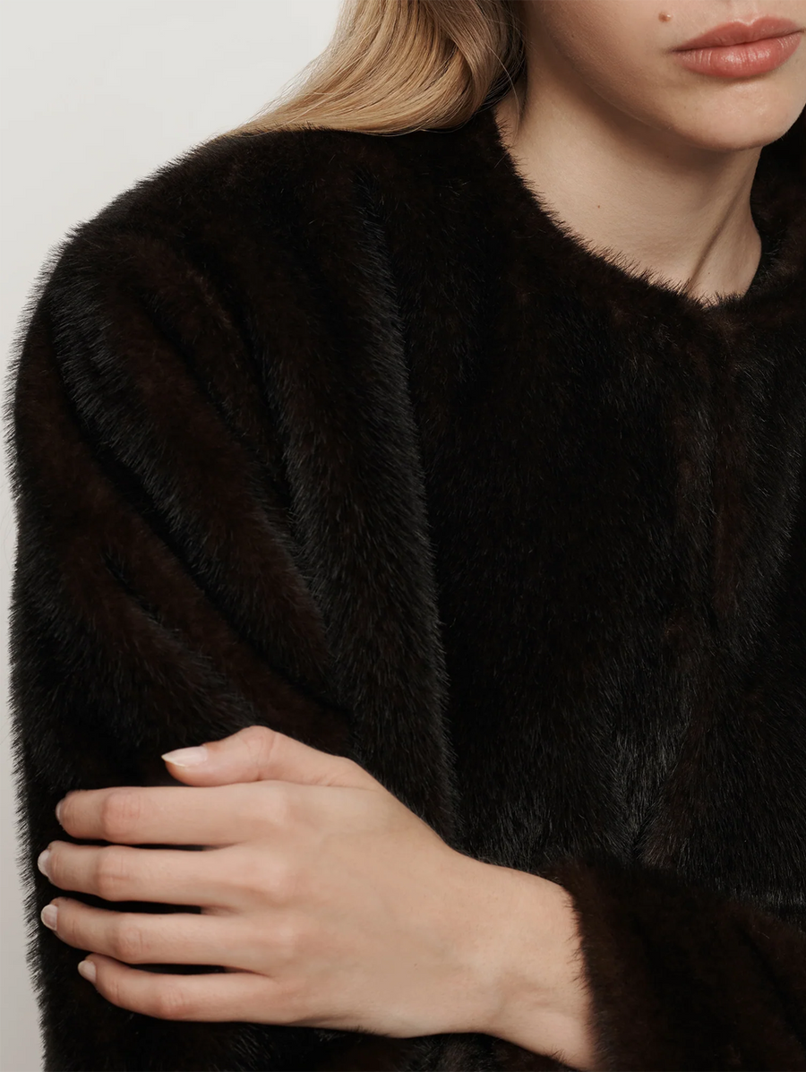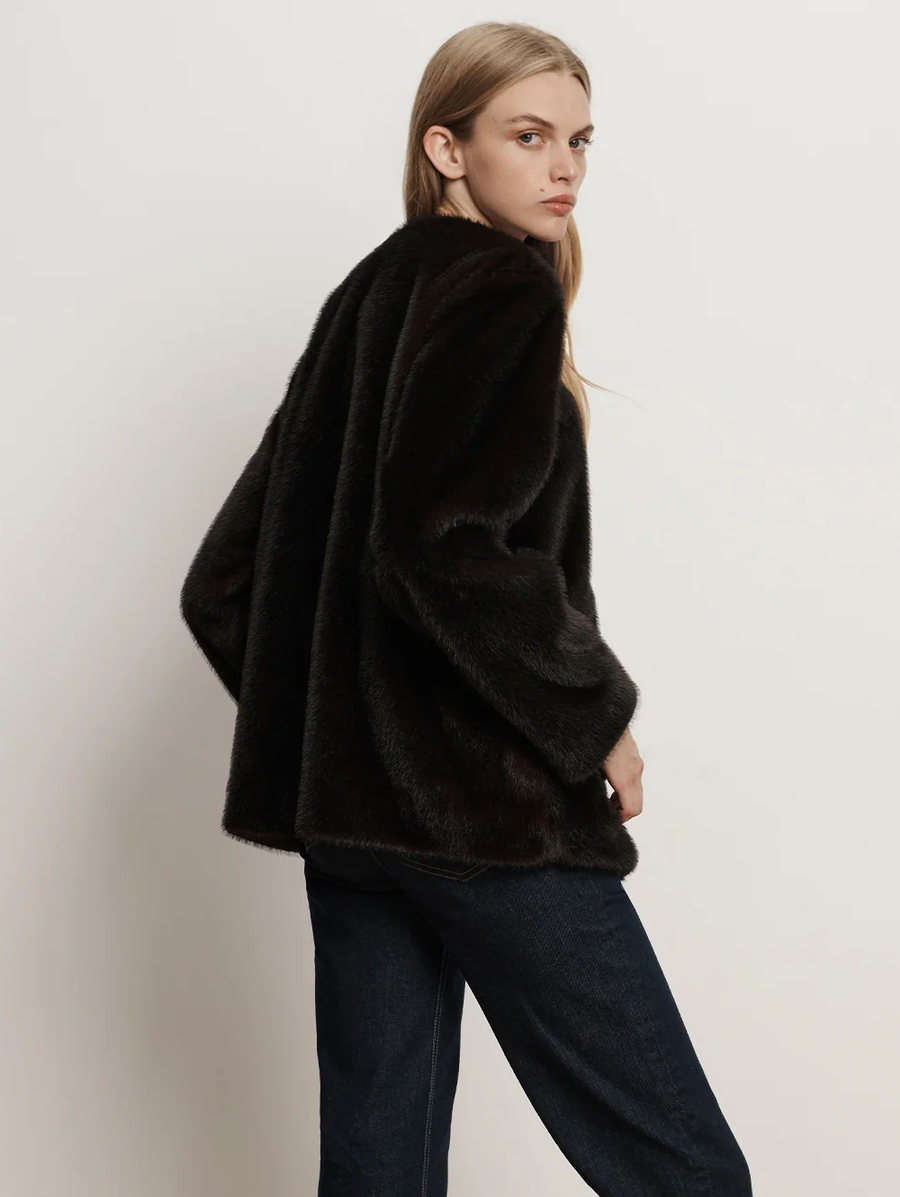 Amy Says... An elegant top layer to elevate any cold-weather look. Crafted from luxurious faux fur in rich brown, the Griselda features a boxy, collarless silhouette with dropped shoulders and a cropped hem, for a more relaxed and modern feel. Finished with a hidden hook-and-eye closure for a clean, streamlined effect, it's a chic layer you'll reach for all season long. Shop Coats.