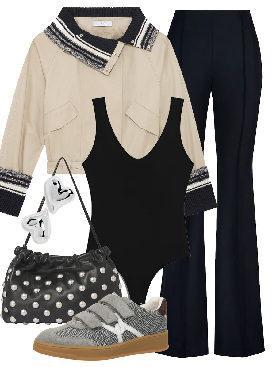 How we're wearing the Rimme Waist Length Jacket: AGOLDE Tora Tank Bodysuit in Black, SMYTHE Pintuck Flare Pant, JENNY BIRD Mega Art Heart Button Earrings in High Polish Silver, A.L.C. Arlo Studded Leather Bag, VERONICA BEARD Reagan Herringbone Velcro Sneaker
