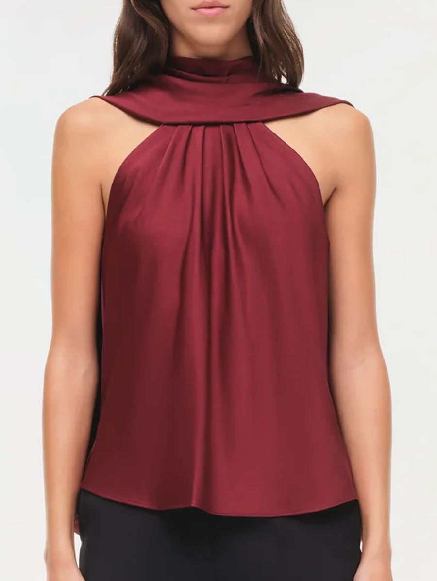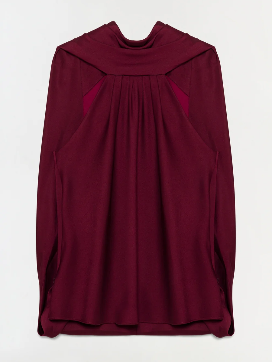Amy Says... The Scarlett Satin Cape Top in Oxblood. A draped satin cape top with a high neckline that gathers into controlled folds, releasing into a graceful back drape that falls with ease. Minimal yet striking, it captures the balance of movement and form. Shop Blouses.