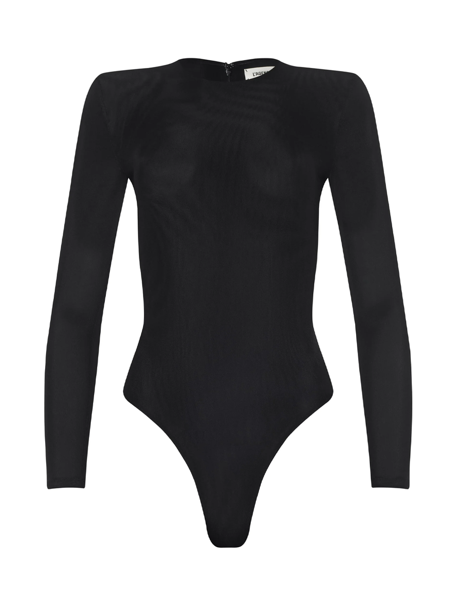 Amy Says... The Trista bodysuit is a form-fitting piece in black mesh with long sleeves and structured shoulder pads. Its semi-transparent design strikes a bold balance between elegance and edge, perfect for layering or statement styling. Shop Blouses.