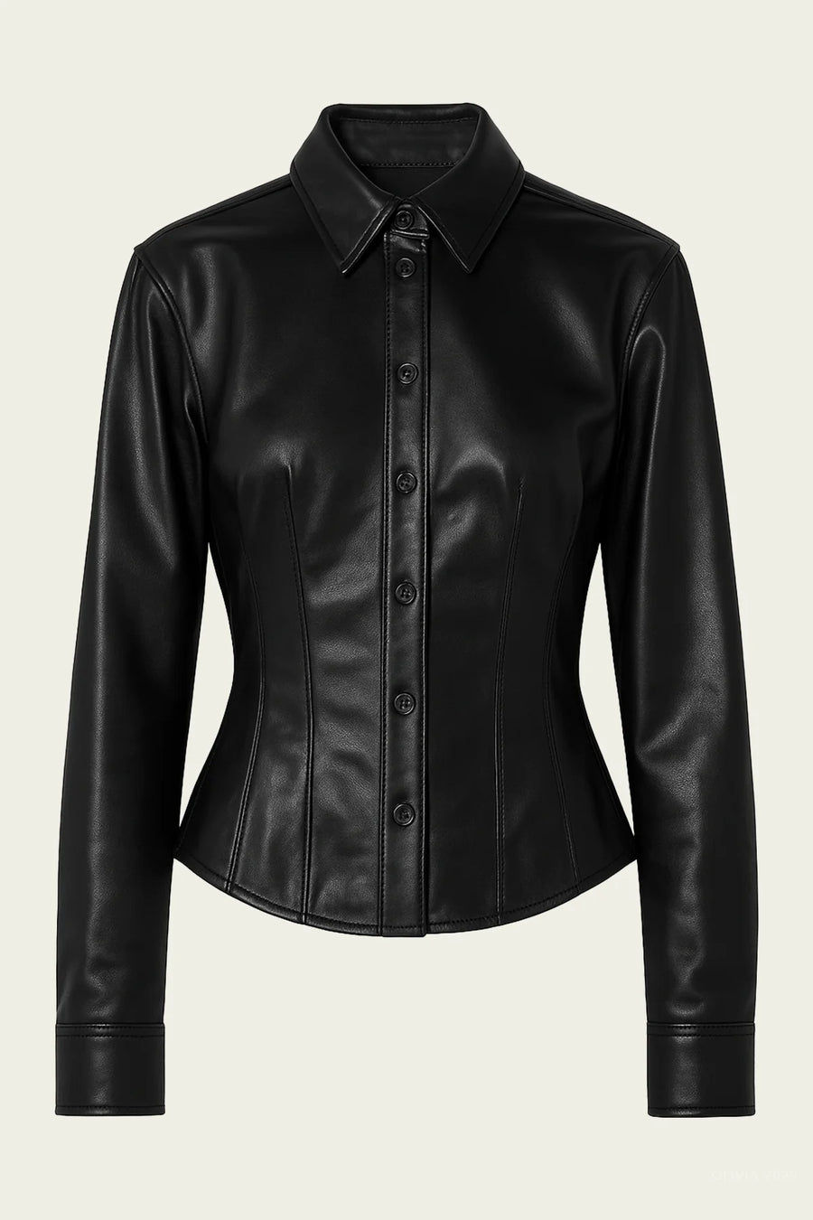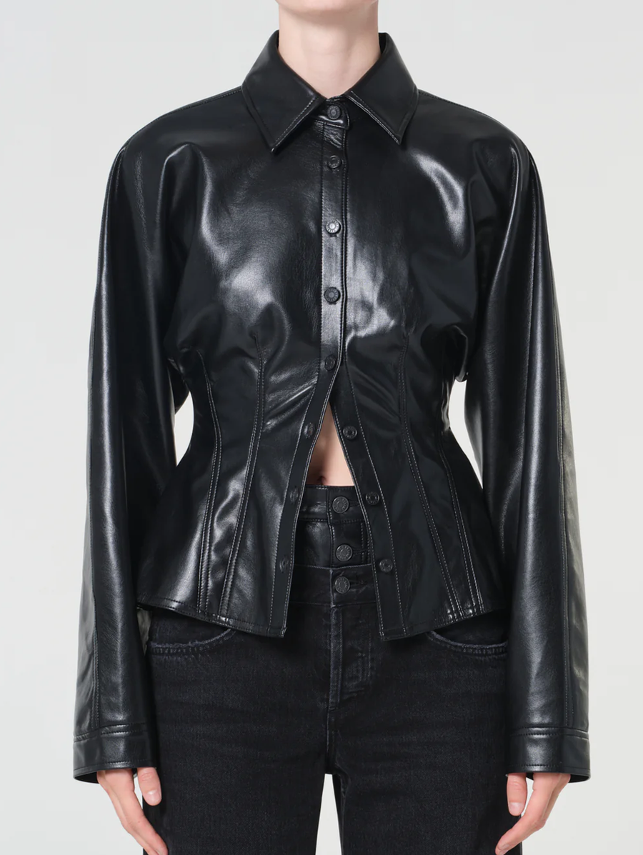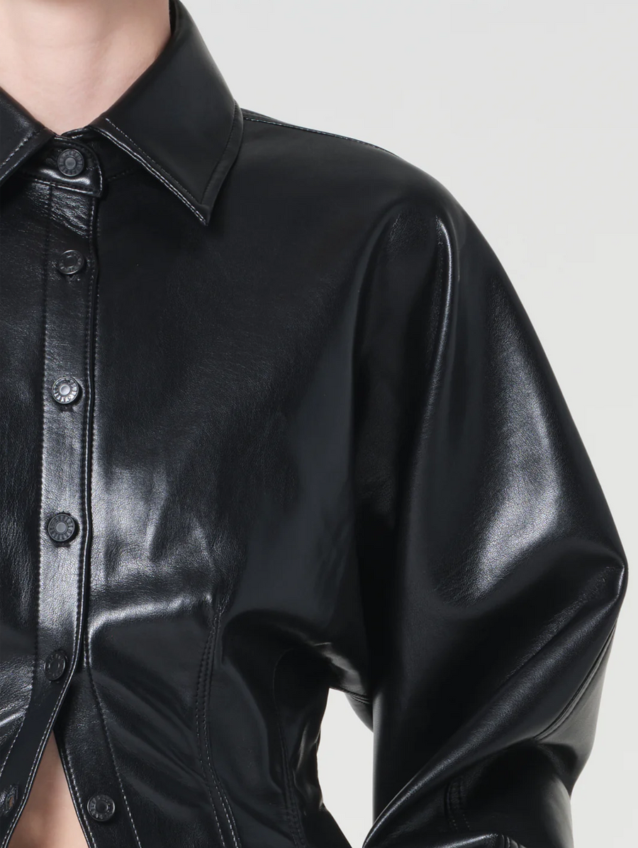 Amy Says... A long-sleeve shirt crafted from soft, matte vegan leather with a subtle stretch. True to size, it has a clean, streamlined silhouette. In black, it’s a minimalist essential that works effortlessly layered or on its own for a modern, understated edge. Looks Like: Luxe black recycled leather shirt with matte finish. Feels Like: Buttery, vegan leather with slight stretch for comfort. Complete the look with the Elson Jean in Detox Raven. This fit is true to size. Shop Blouses.