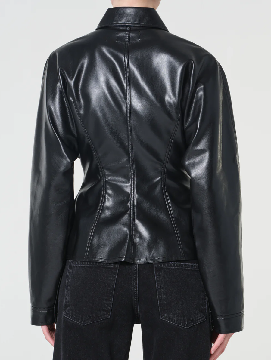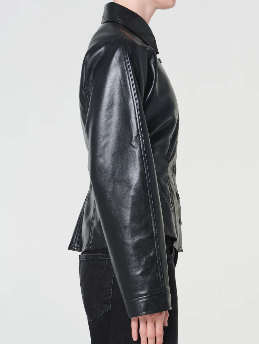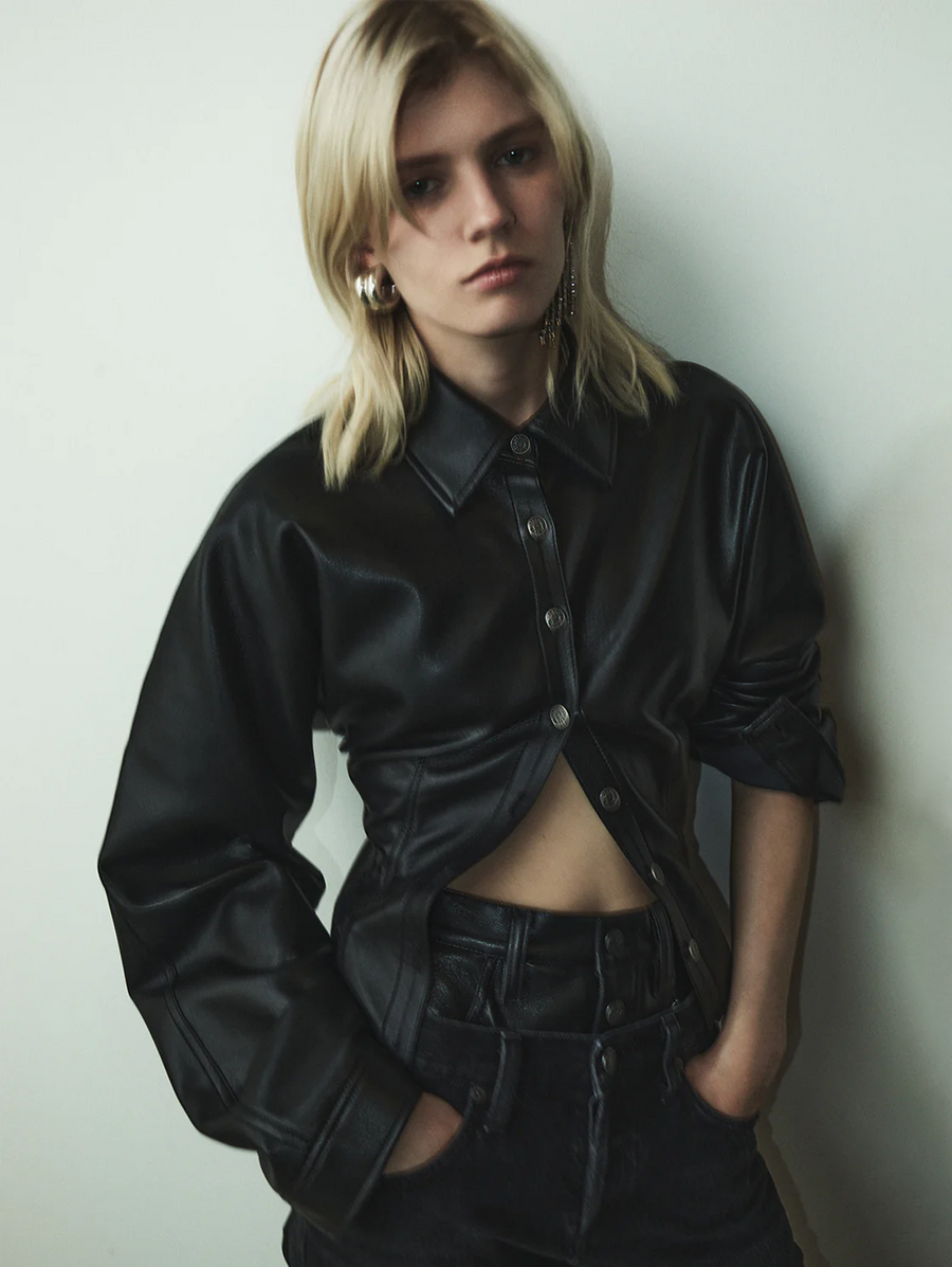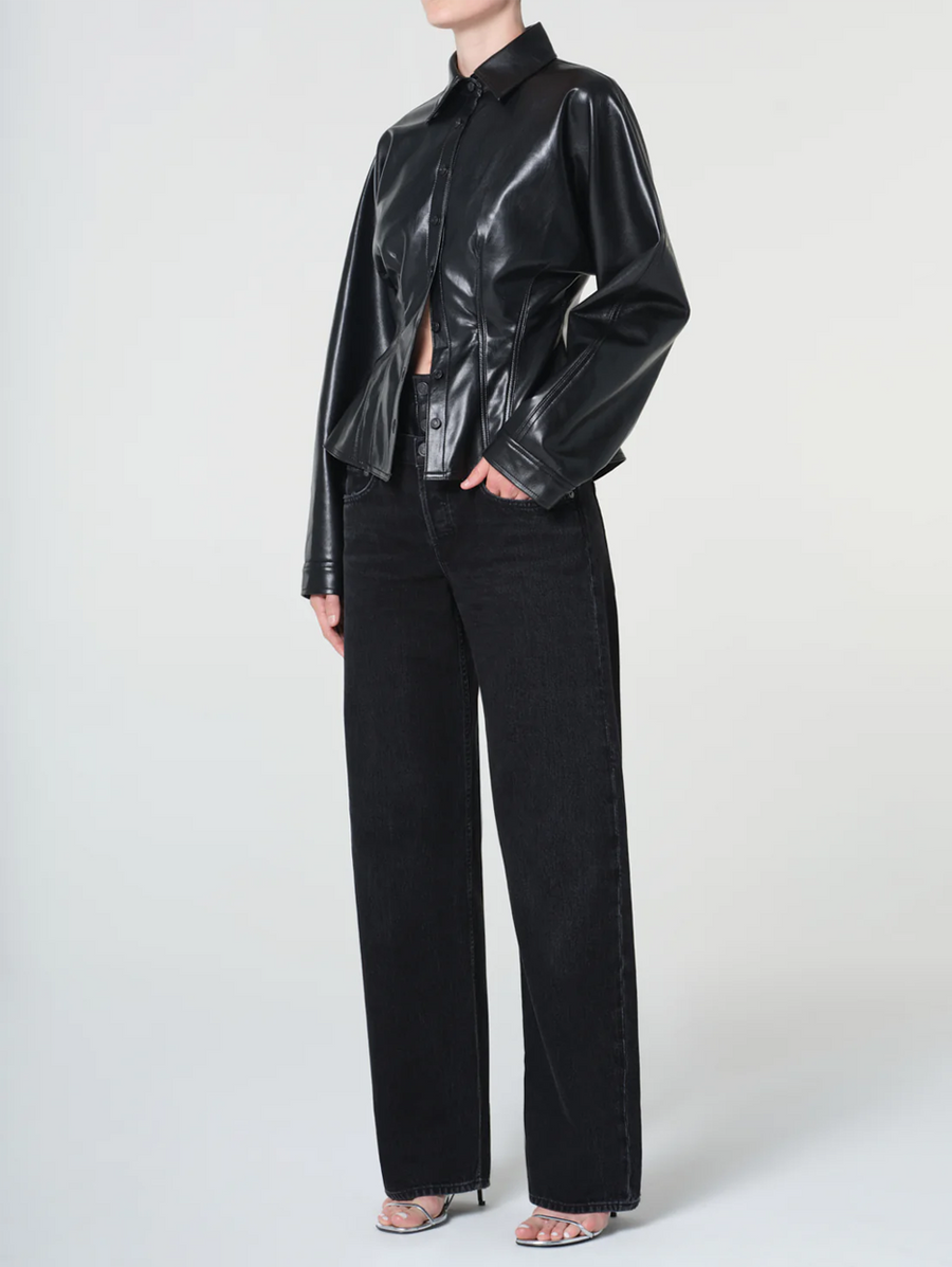 Amy Says... A long-sleeve shirt crafted from soft, matte vegan leather with a subtle stretch. True to size, it has a clean, streamlined silhouette. In black, it’s a minimalist essential that works effortlessly layered or on its own for a modern, understated edge. Looks Like: Luxe black recycled leather shirt with matte finish. Feels Like: Buttery, vegan leather with slight stretch for comfort. Complete the look with the Elson Jean in Detox Raven. This fit is true to size. Shop Blouses.