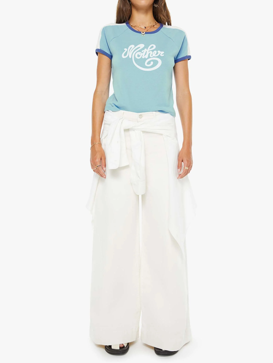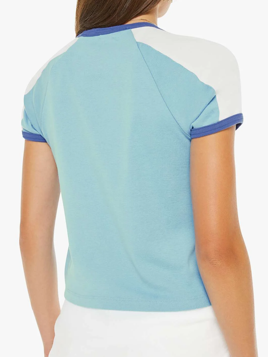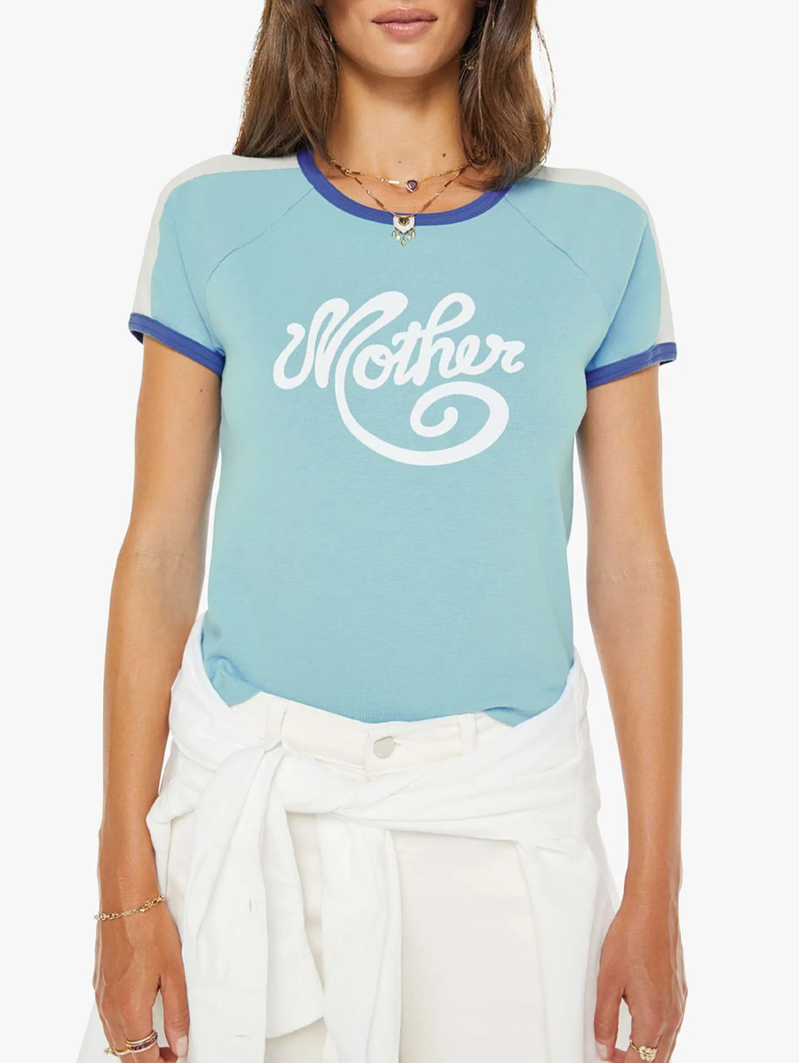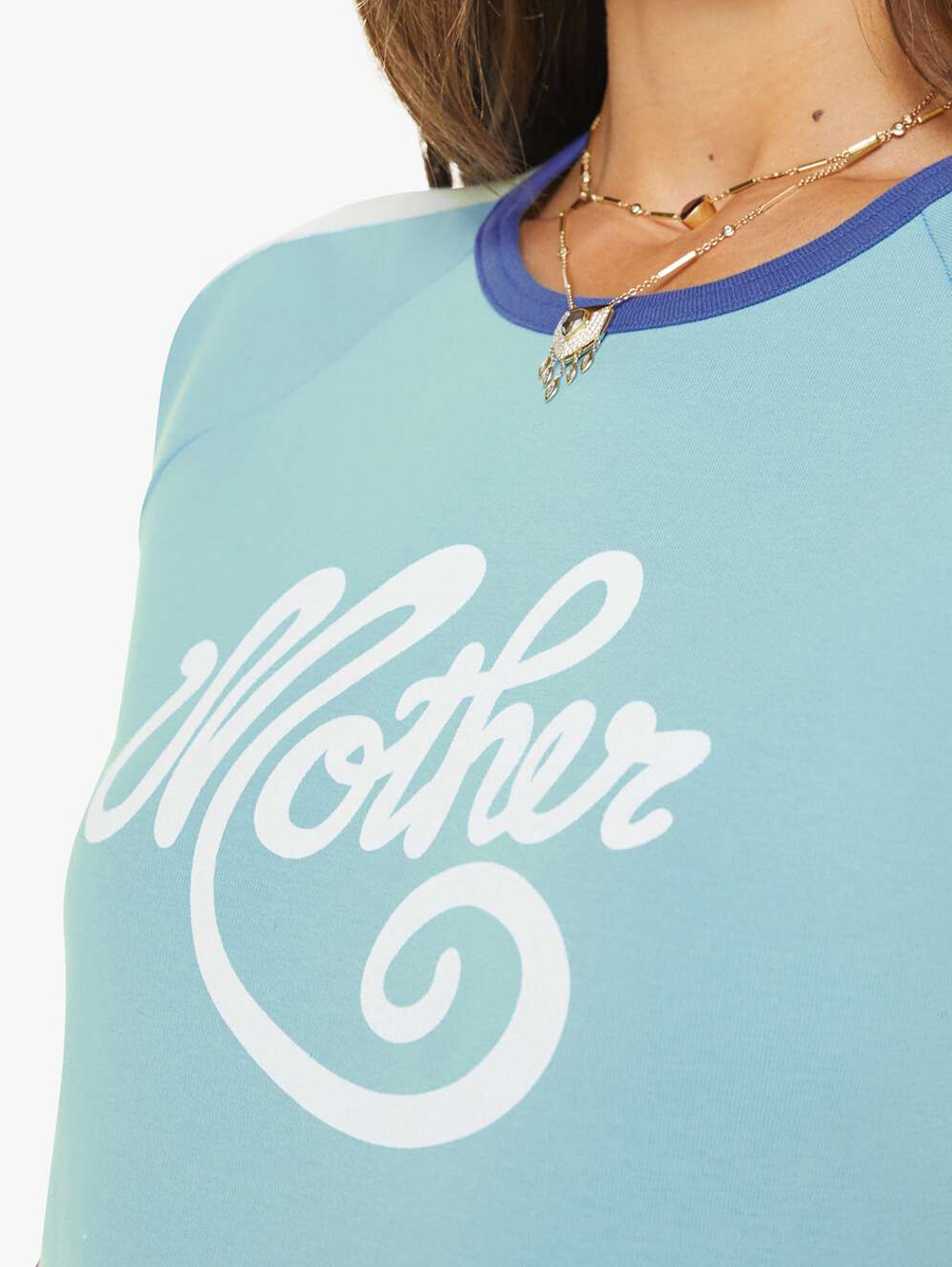 Amy Says... Need for speed. A vintage-inspired raglan tee with a crew neckline, short sleeves and a shrunken fit. Made from 100% cotton in baby blue, the tee features navy trim, white panels on the shoulders and MOTHER's name in cursive on the front. Shop Tops.