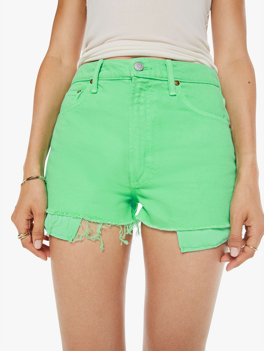 Amy Says... Micro shorts from SNACKS!, a collection of unconstrained silhouettes leaning into exaggerated shapes and extreme proportions. Experimental and non-era specific. For everyone, or not. Designed to be worn loose and low at the hips, the shorts feature a zip fly, exposed pocket liners and a raw hem. They're made from a cotton blend in neon green with a pretzel-detailed button and candy-inspired interior rivets. Would you like a treat?