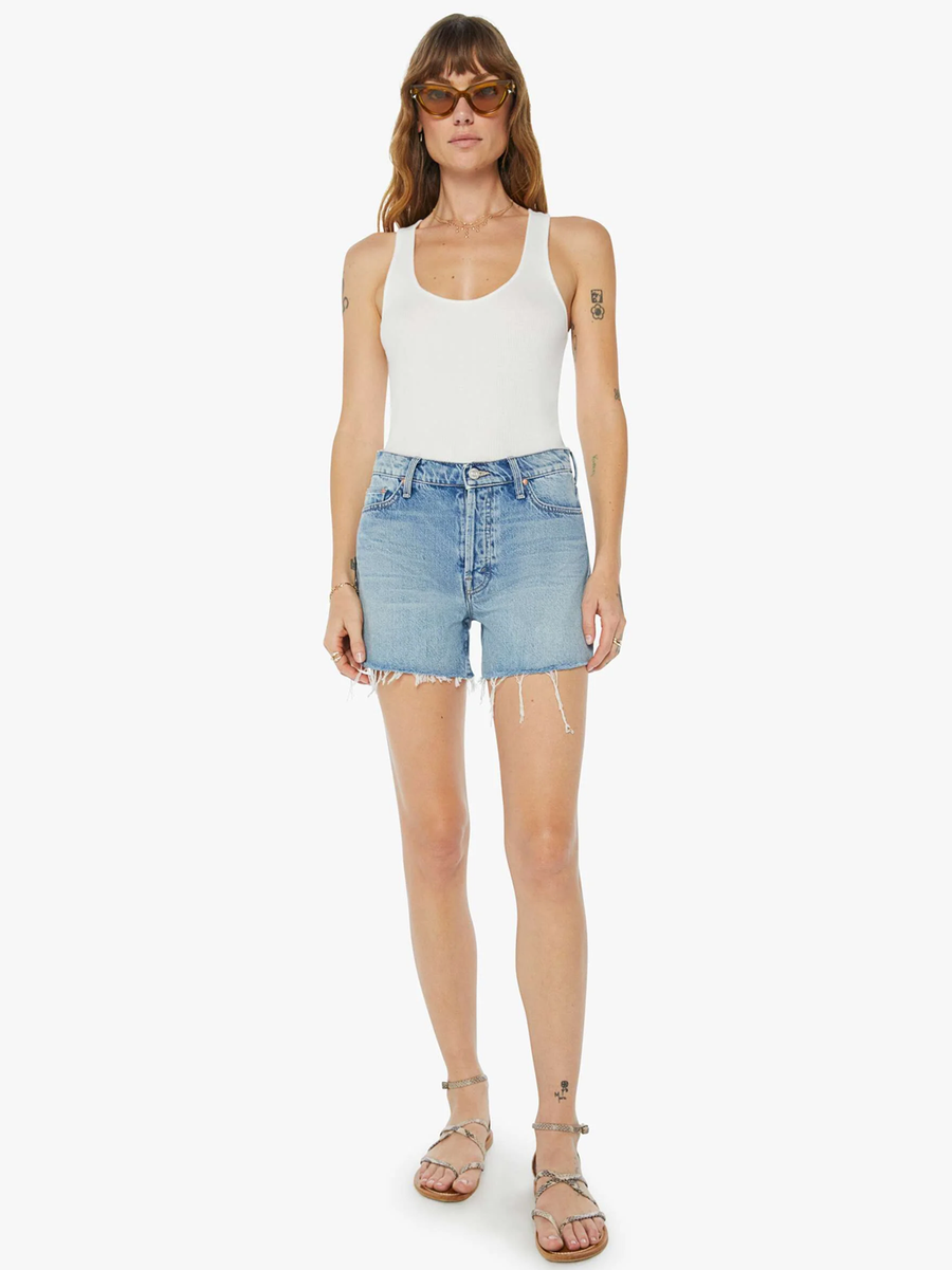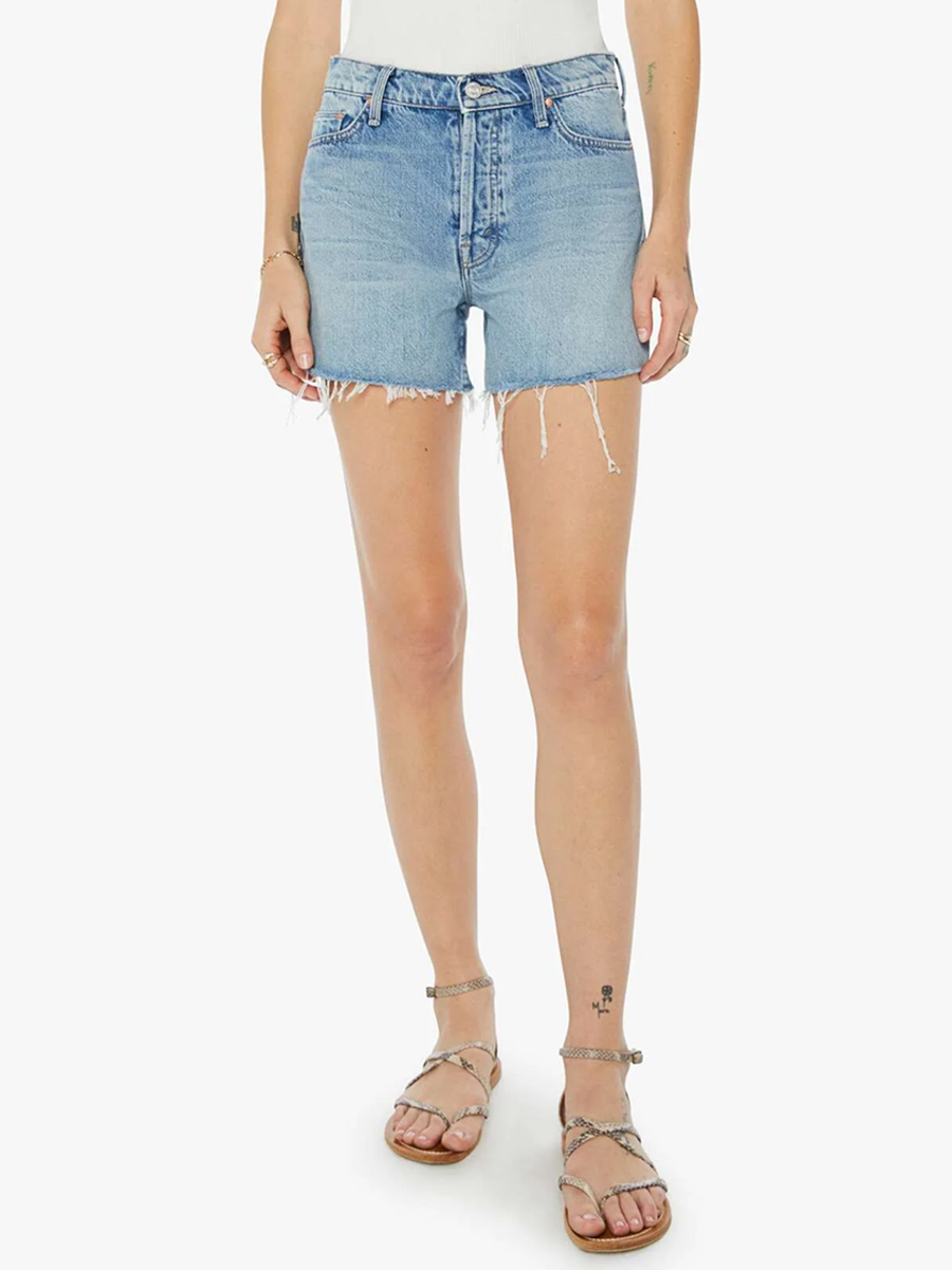 Amy Says... Get the jump on it. High-waisted denim shorts with a frayed hem and vintage-inspired fit. Cut from 100% cotton, Leap At The Chance is a light-blue wash with whiskering and fading throughout. These shorts are rigid and take time to break in. MOTHER suggests sizing up one size.