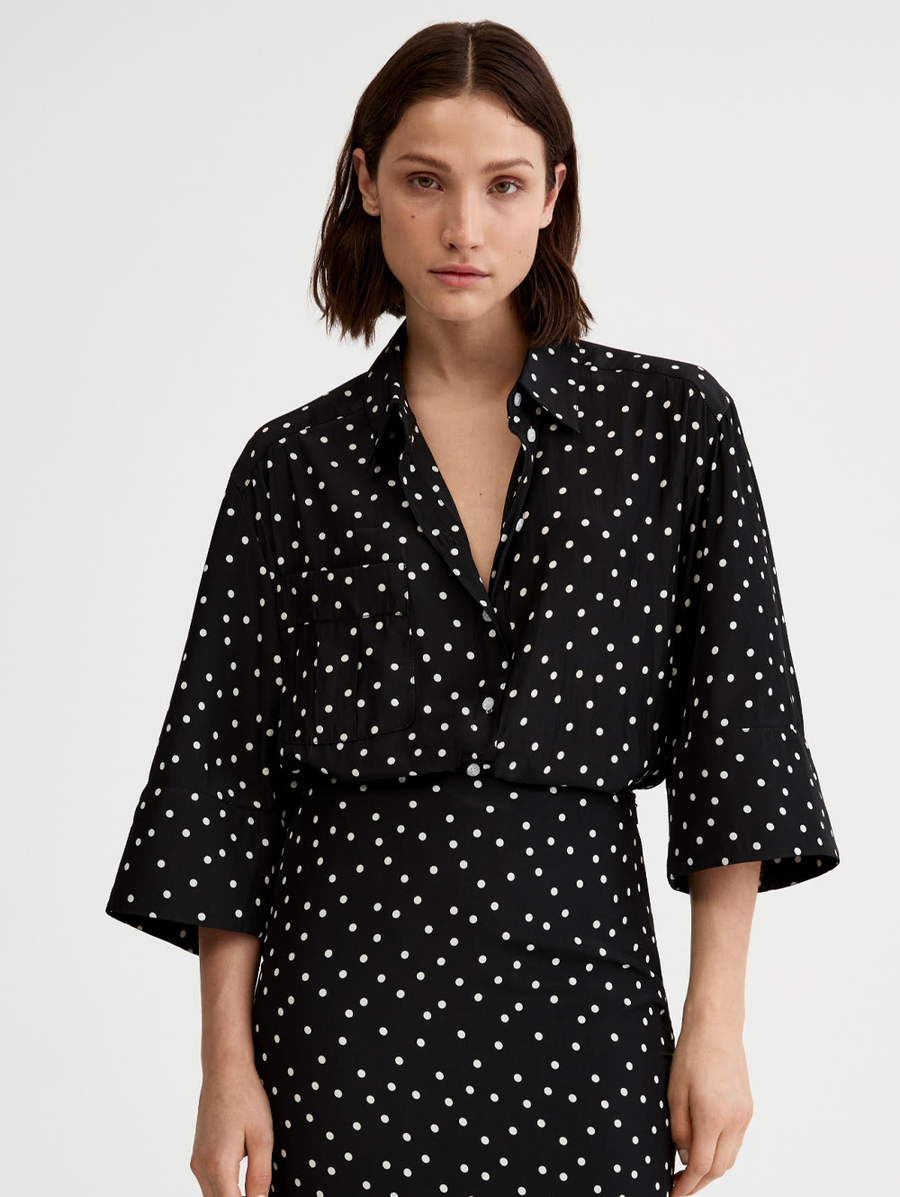 Amy Says... Moderately tailored, this modern take on a classic button-down features elbow-length sleeves and an exaggerated point collar. This garment fits true to size, take your usual size. Shop Blouses.