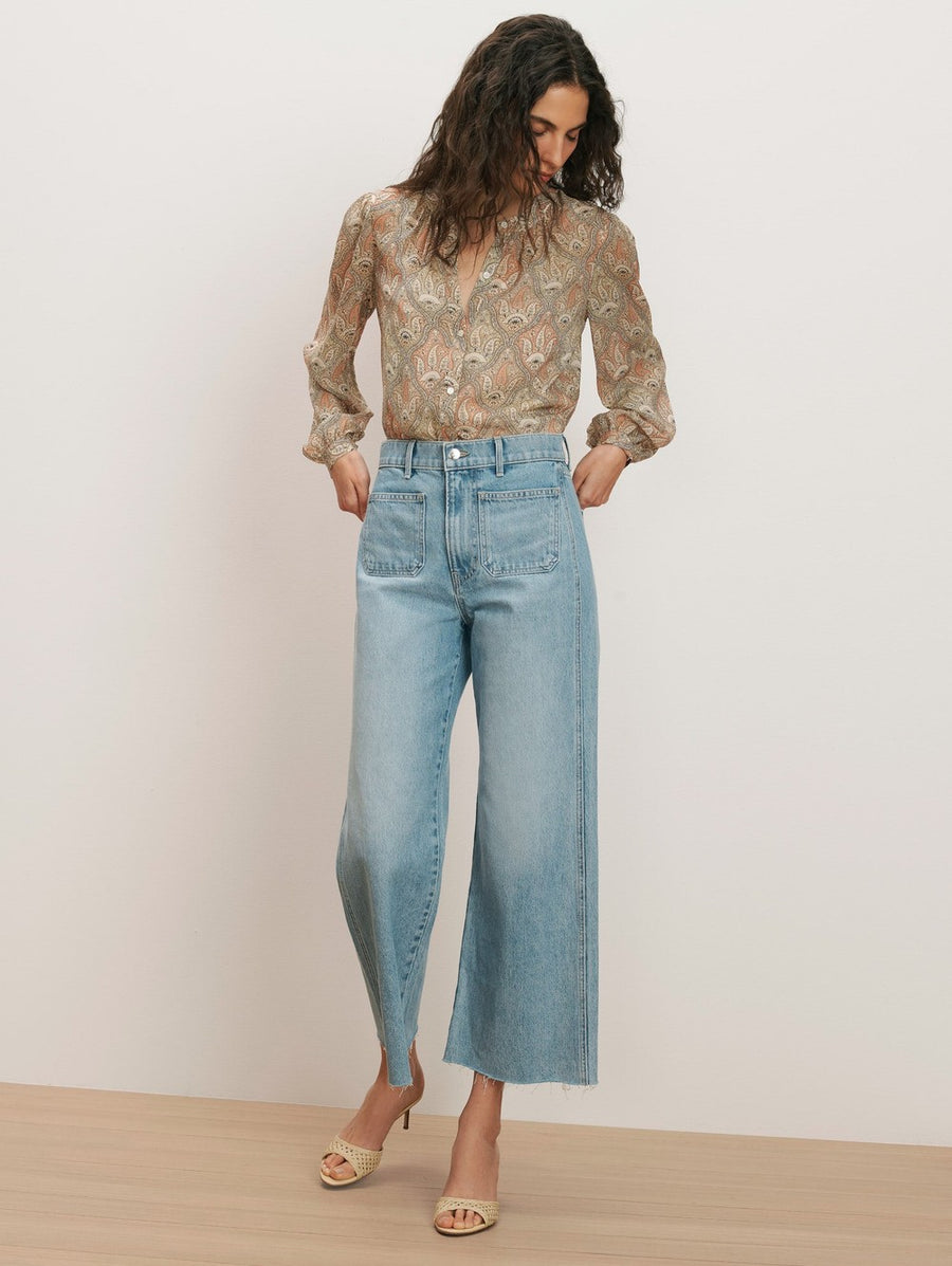 Pair it with a tailored wide-leg trouser and a pointed-toe heel for a polished daytime look. Tuck it into high-waisted slim denim and add a flat sandal when the day calls for something more relaxed. A minimal structured bag keeps the palette clean and lets the print lead. -