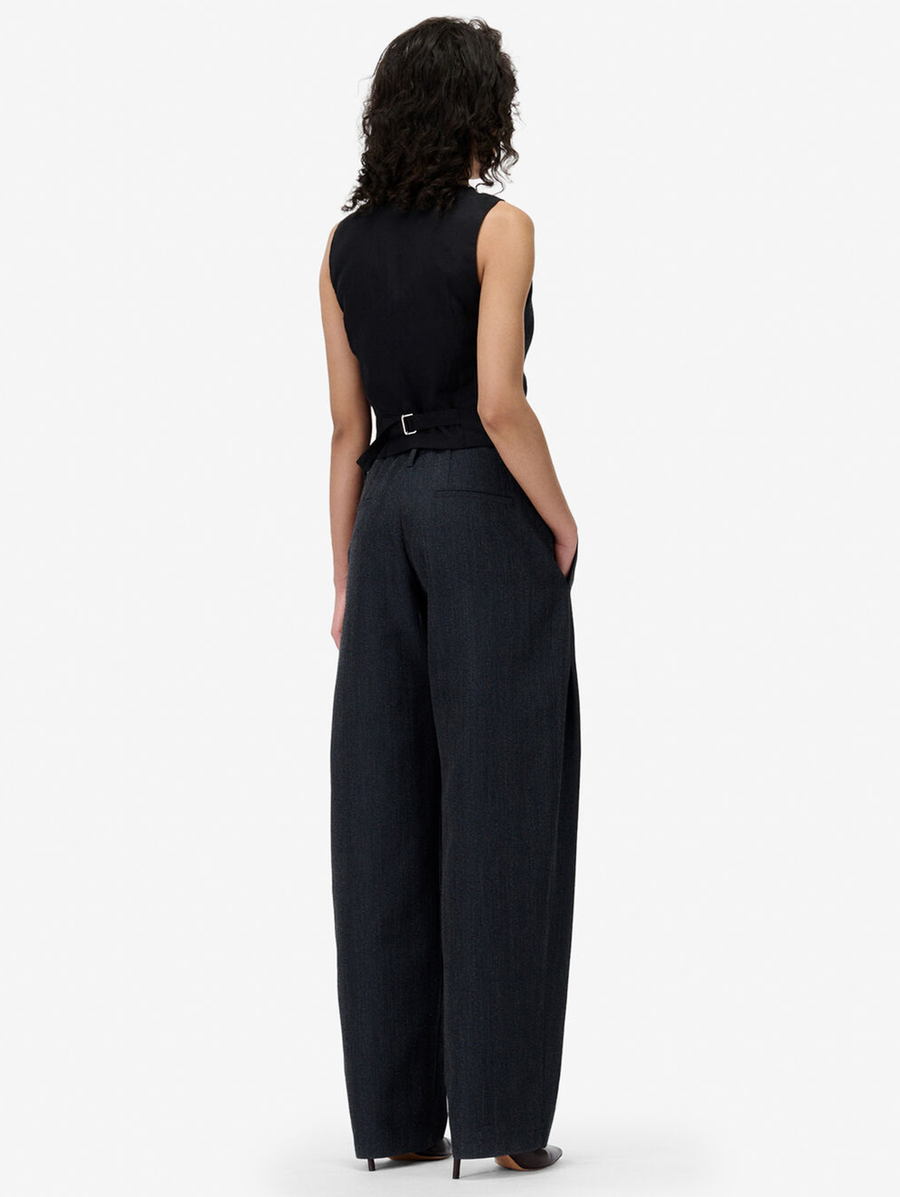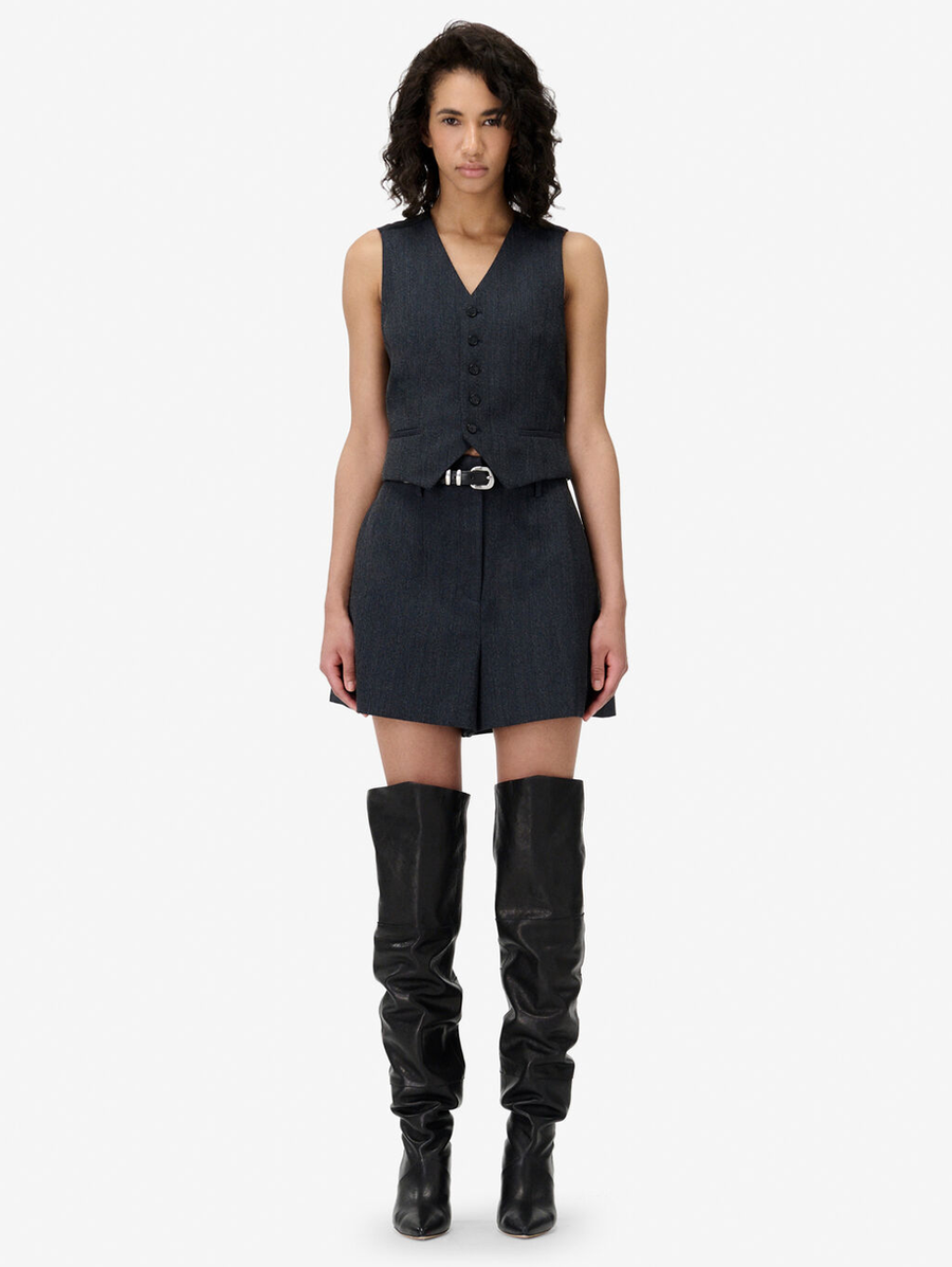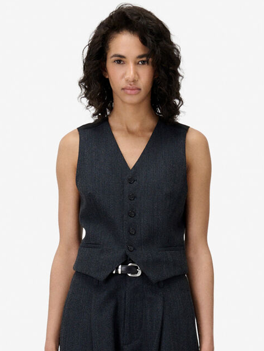Amy Says... The perfect mix of masculine and feminine. The Benyo vest in wool blend is finished with front button closure and buckle belt at the back. This bi-material suit vest pairs perfectly with denim and tailoring alike—complete the look with the coordinating Bamia High-Waisted Shorts. Made in Europe. Shop Tops. -