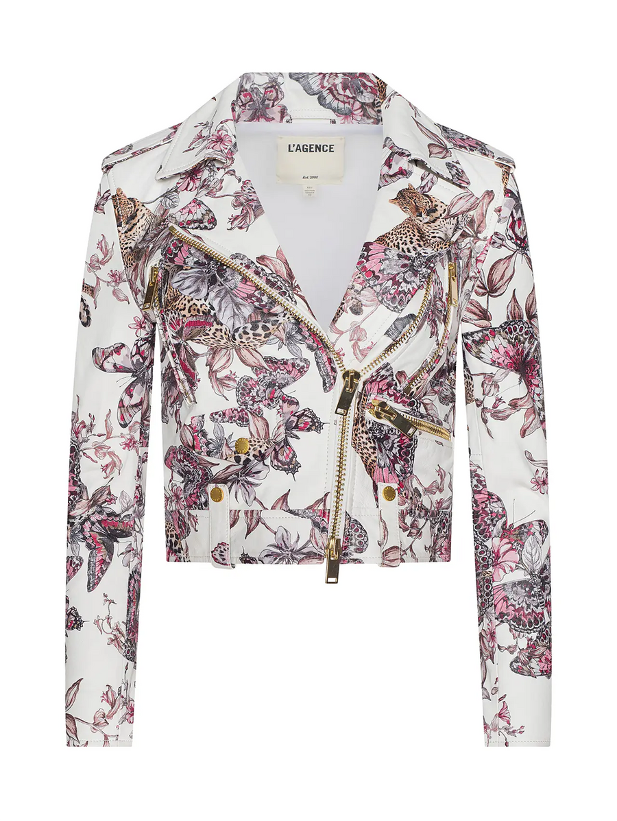 Amy Says... This L'Agence signature biker jacket is crafted with a slightly cropped finish and motorcycle detailing from pockets to zipper hardware. This wardrobe hero is now back in a statement butterfly jungle print. Shop Jackets.