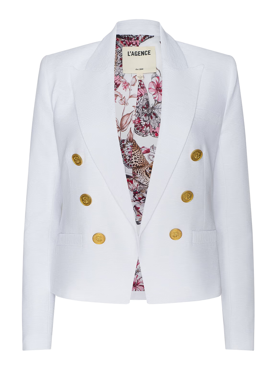 Amy Says... The bestselling open-front Brooke features a flattering, tapered fit. Crafted from a lightweight ribbed ottoman fabric featuring a cool, slick hand and subtle luster, this sharp, double-breasted blazer is now back in white and lined in a chic butterfly print. Shop Blazers.