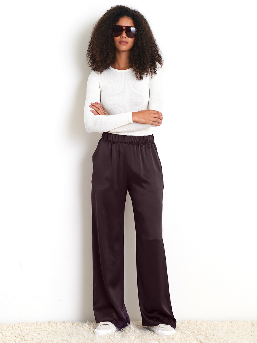 Amy Says... A versatile pant with a flattering silhouette. Expertly crafted in the USA from 100% silk charmeuse, the Brynn pant features a flattering high-rise waist—sans belt loops for a flat, clean look—and falls to a relaxed, wide leg. Style it with the Sonya Flowy Top in Oak Tree for a cohesive suit or with a simple knit for ease. Shop Pants.