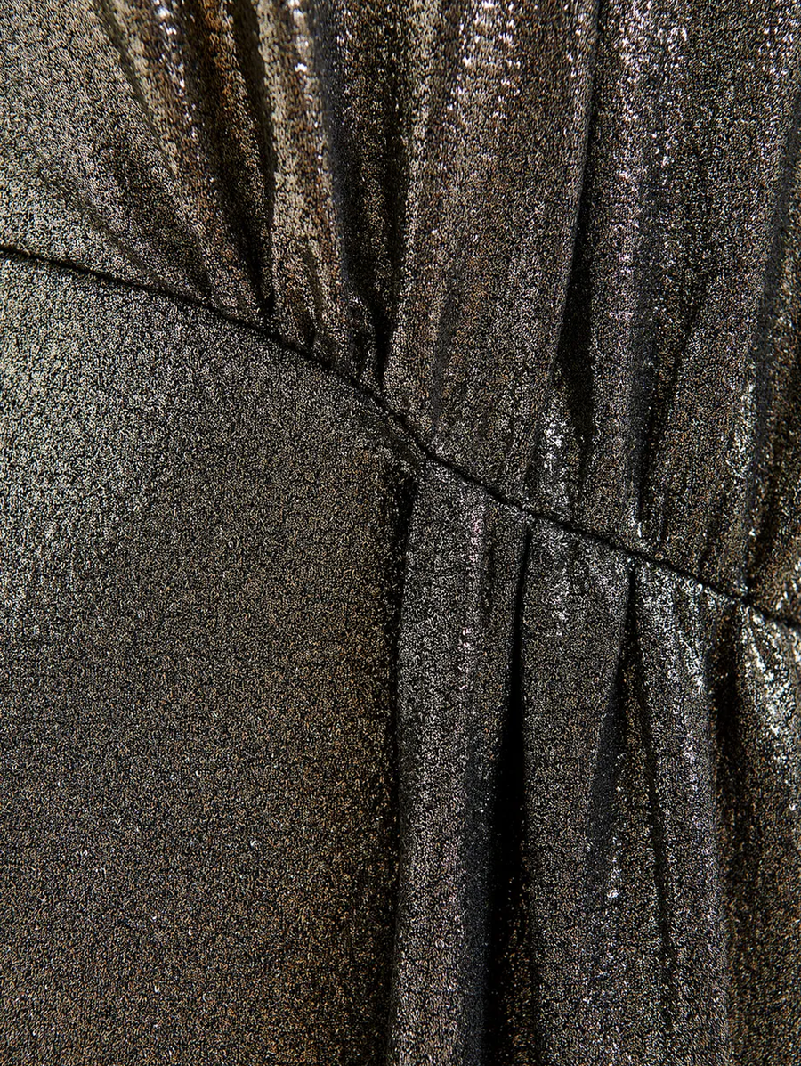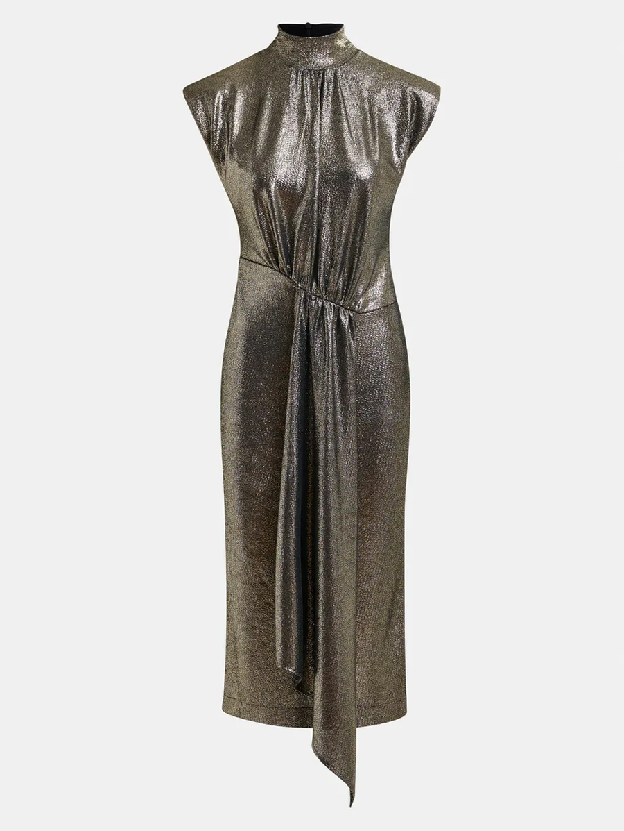 Amy Says... The Iquarius Midi dress is cut from a lurex fabric that is scattering for a glamorous, light-catching finish. It has a figure-hugging fit at the waist before falling to a wrap-inspired skirt with box pleat gathering at the front. The lightly padded shoulders and mock neck complete the design. Shop Dresses.