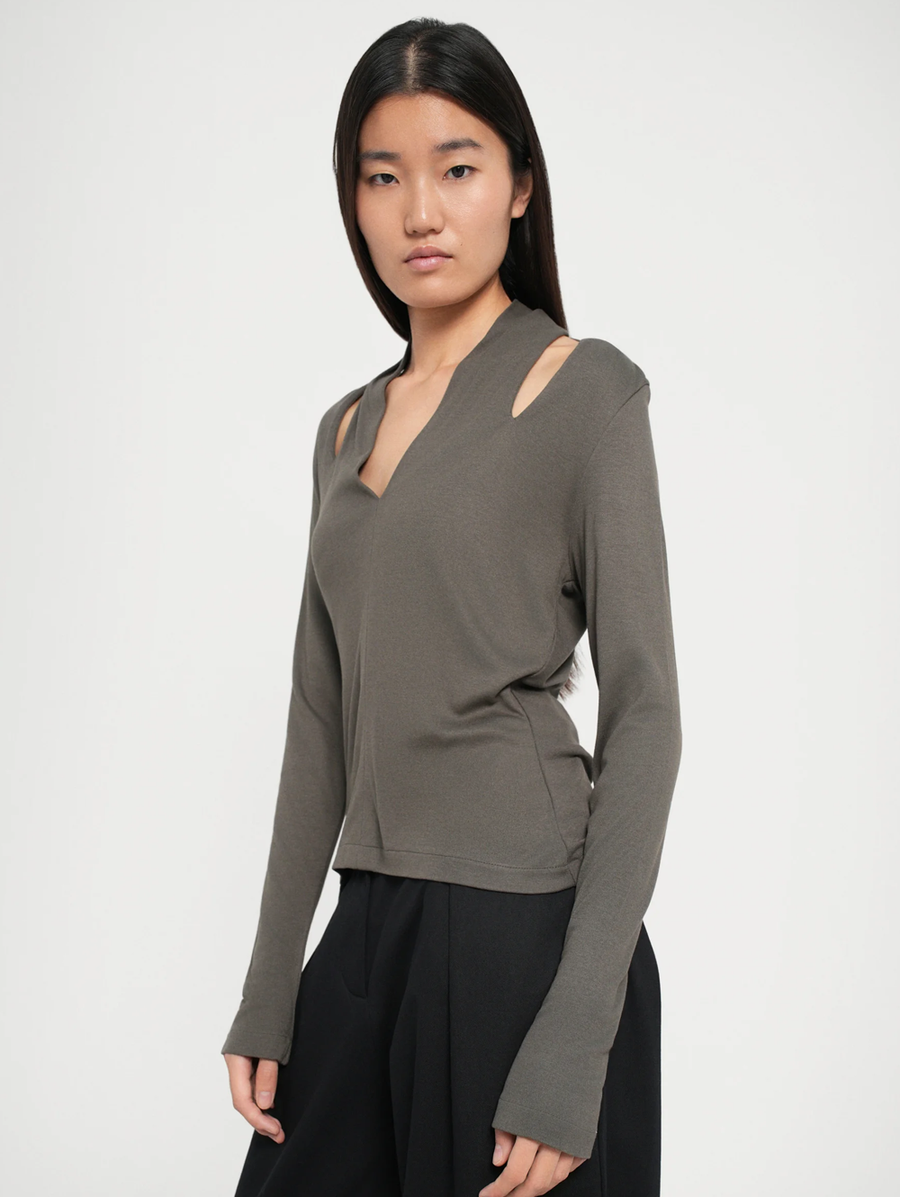 Amy Says... This woman's long sleeve tee is crafted from luxurious jersey and features a flattering V-neckline. Designed with a sleek, solid pattern, featuring a V-neckline, cut-out shoulder details, and a relaxed fit; it's a versatile layering piece. Shop Tops.