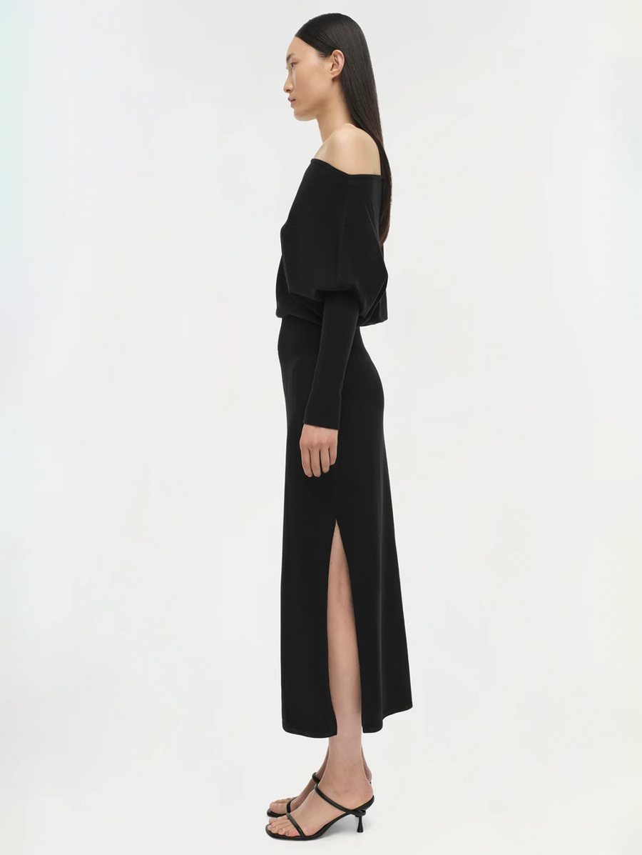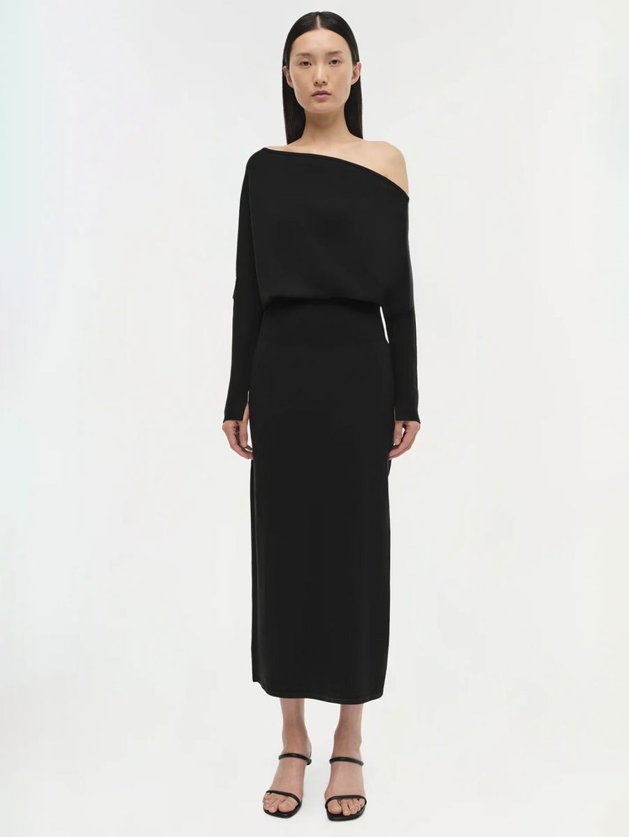 Amy Says... The Janese Off Shoulder Midi Dress in Black is knitted in featherweight wool. This chic midi dress is designed with a wide neckline that slips effortlessly off the shoulder. A fitted waistband defines the silhouette, while the straight skirt falls to mid-calf. Clean lines and refined proportions make it a versatile piece. Shop Dresses.