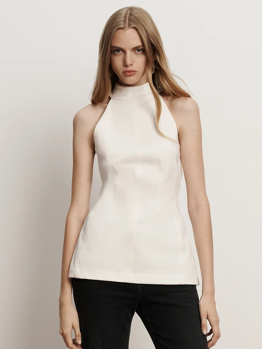 Amy Says... Sleek and sophisticated. Crafted from a premium stretch blend in white, the Johanne top features a halter neckline with waist and back darting for a flattering fit, finished with a back zip closure. Pair it this sleeveless top with the coordinating Kalinda Wide-Leg Ponte Pant for a chic set, or layer over a maxi skirt for evening. Shop Tops.