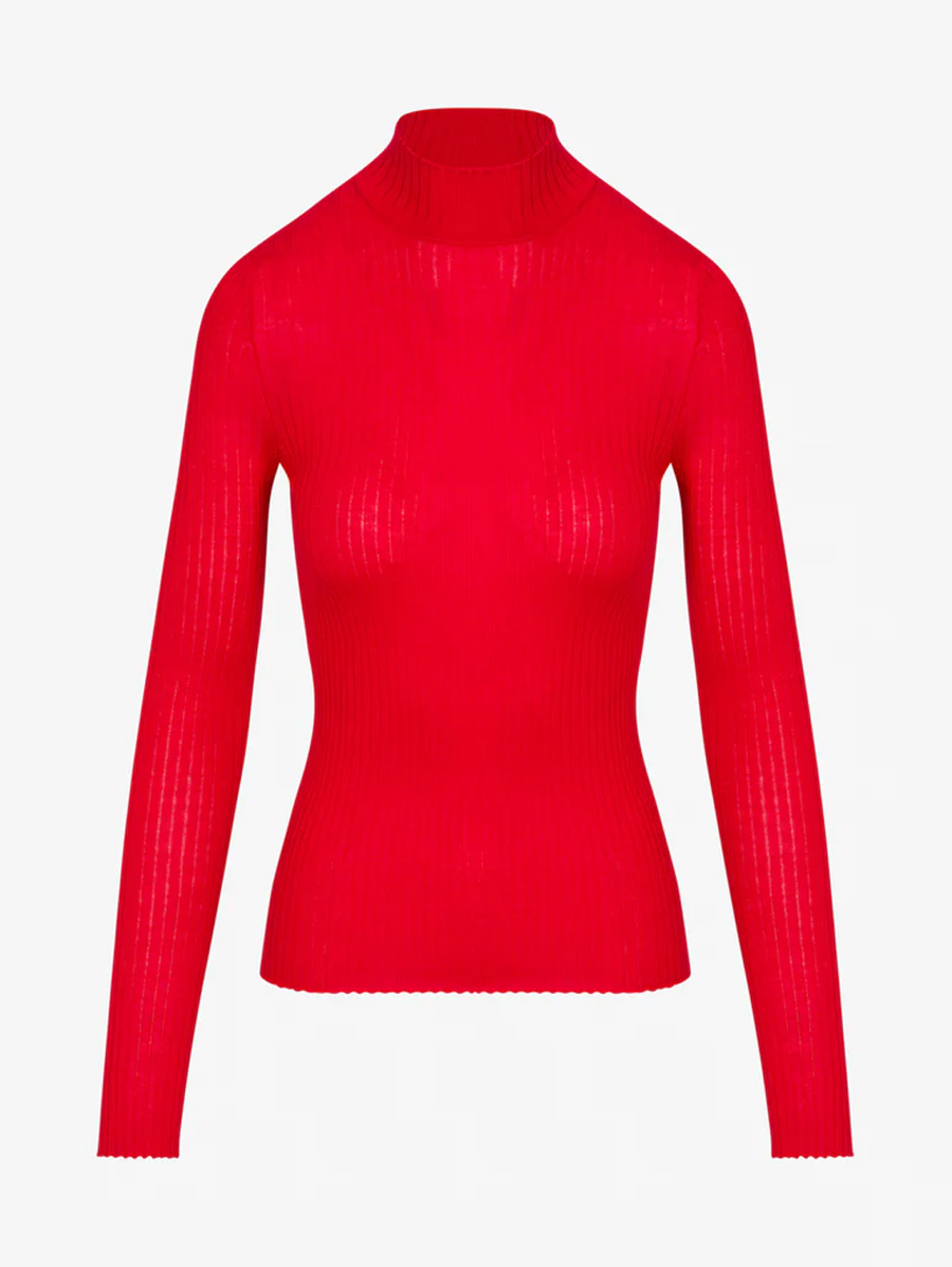 Amy Says... Finely knitted in our high quality, ultra-soft Mongolian Cashmere, this lightweight long sleeve essential will easily become a wardrobe favorite. Elegantly designed with playful lettuce hemlines, this vertical ribbed mock-neck has just the right amount of stretch, and is slightly fitted for a slimming look. With a wide range of styling options, this top tucks seamlessly into all of your high waisted bottoms making it the perfect layering piece to pair with your favorite SPRWMN jeans or trousers. Shop Tops.
