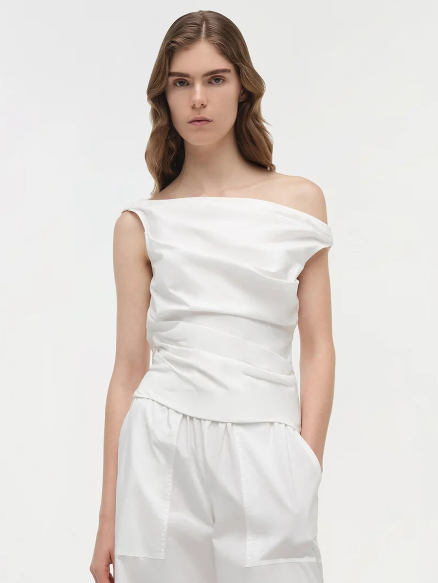 Amy Says... The Maisel Draped Cotton Top in White. This draped top is cut from crisp cotton poplin and defined by a clean boat neckline and a softly ruched bodice. Shop Tops.