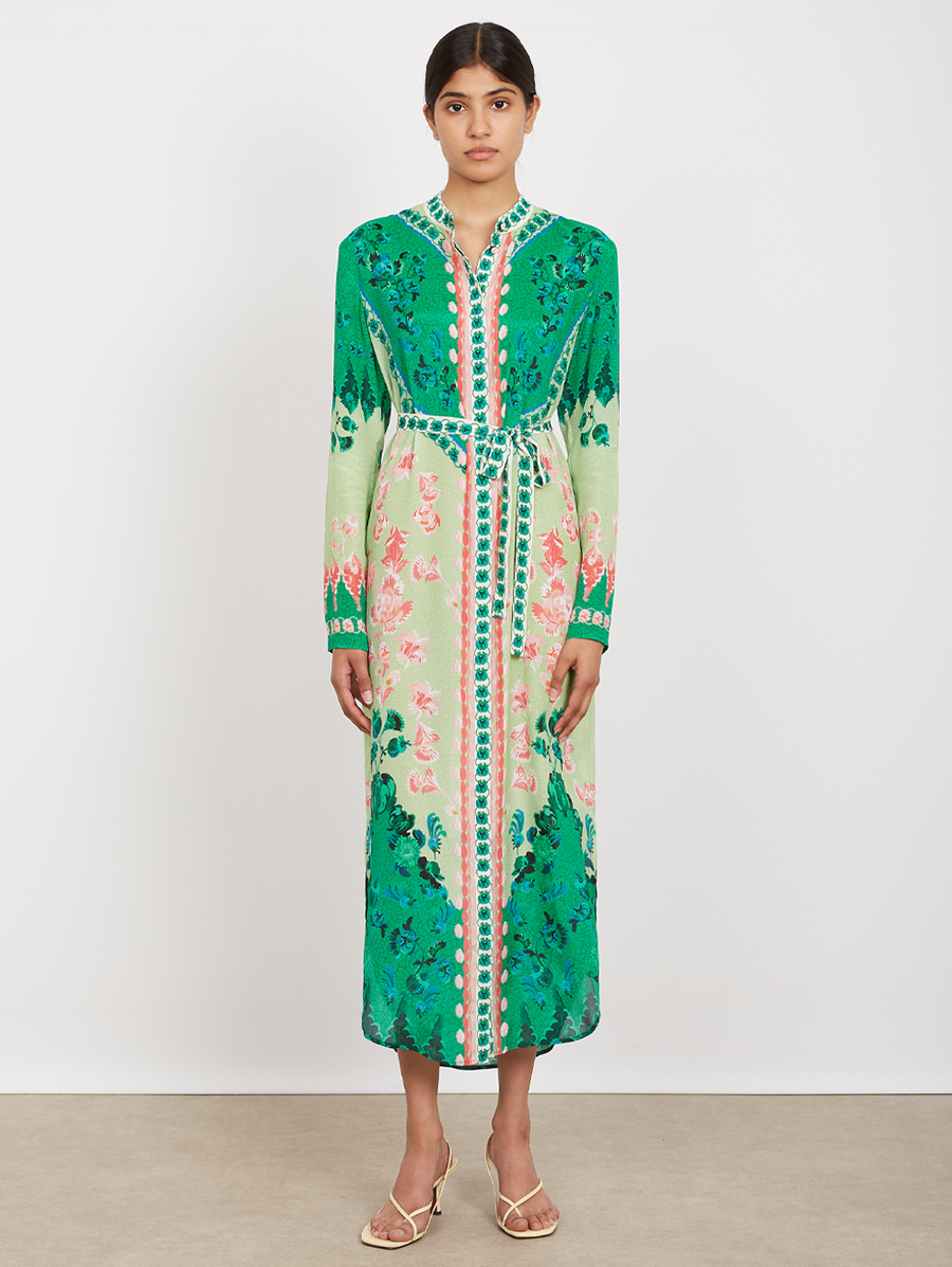 Amy Says... The Molly-D Dress combines relaxed elegance with elevated details, making it a versatile wardrobe staple. With long sleeves, a tie waist, and button-front fastening, it offers comfort and a flattering silhouette. The custom print features a mosaic of lush and pale green decorated with a trail of soft flowers, creating a bold yet harmonious look for day or evening wear. Shop Dresses.