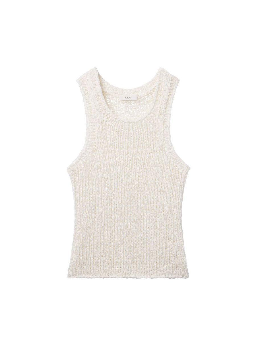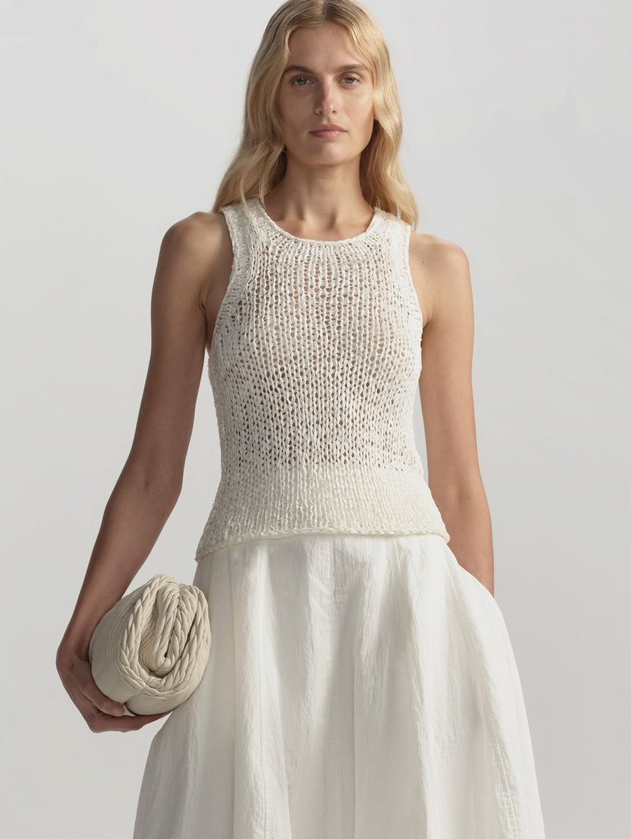 The wide-tape Italian viscose yarn gives this top a texture you can actually see and feel, which is rare at this silhouette. An open, dimensional knit in a figure-skimming cut means it looks polished without trying too hard. This is the top that makes people ask where you got it. -
