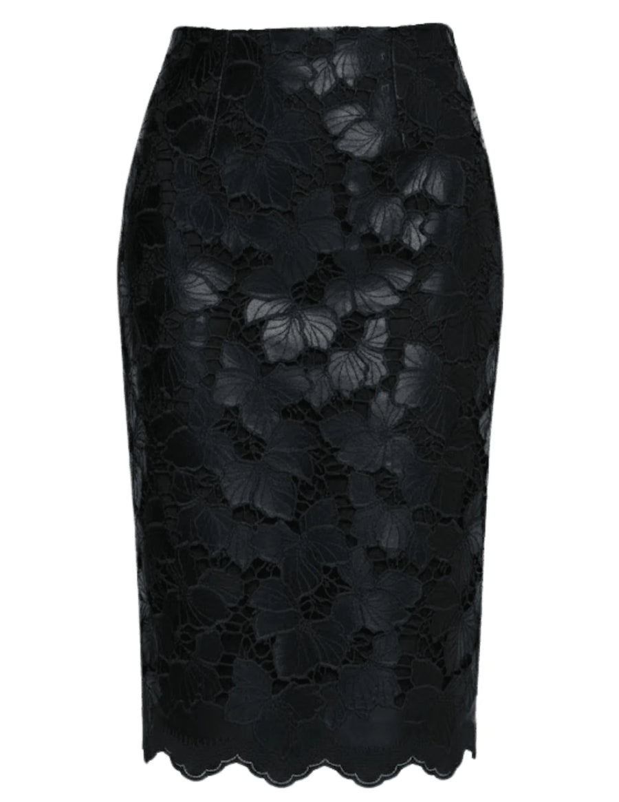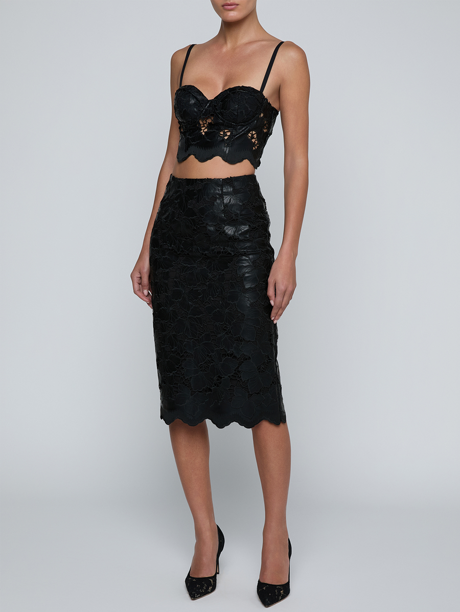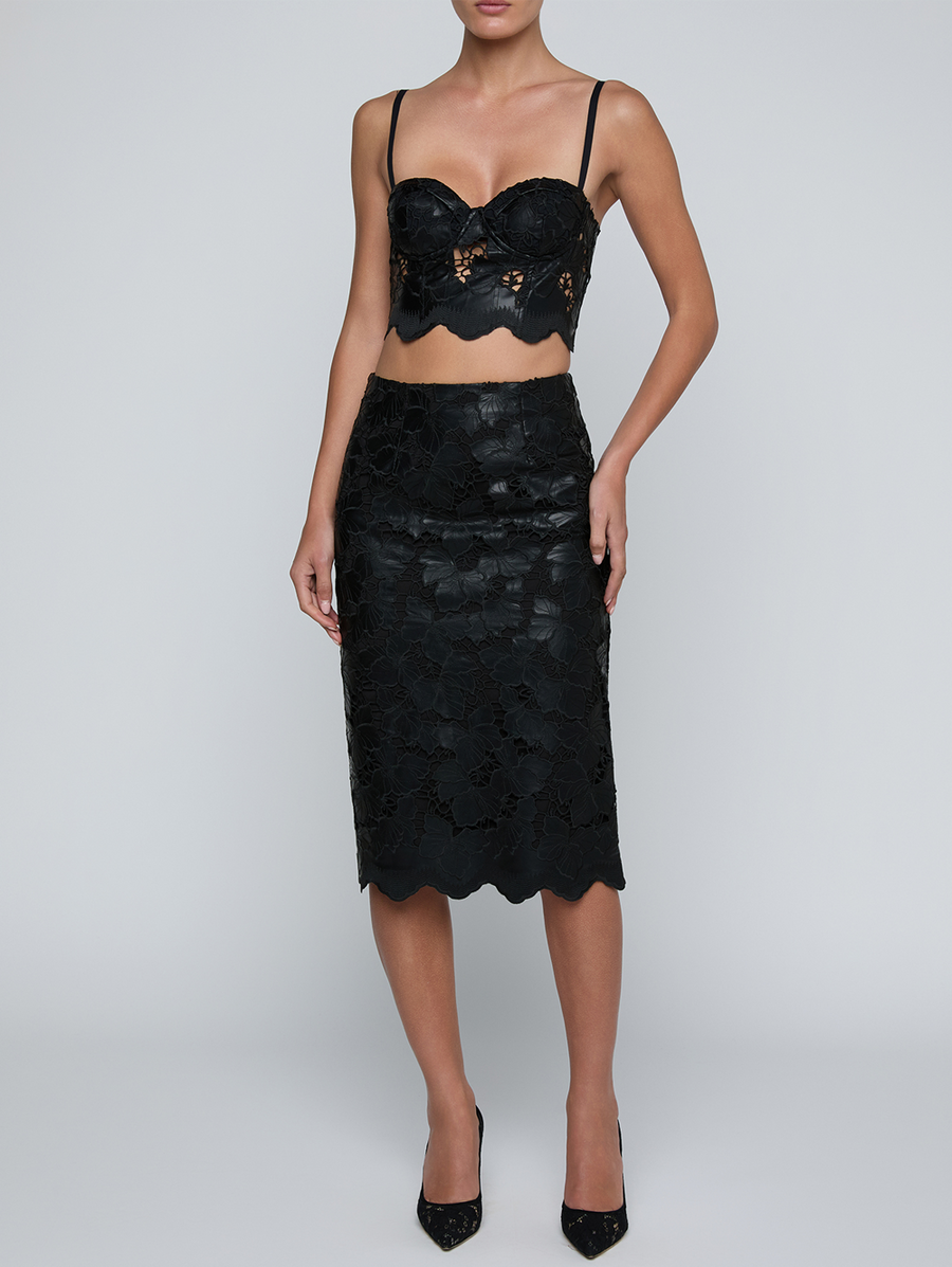 Amy Says... Cut from vegan leather lace in a classic black hue, the Royal delivers unapologetic allure with a refined finish. The sleek design creates a perfect balance of sultry and sophisticated. Pair it with the coordinating Sonya Lace Bustier or your favorite tee and finish with an oversized blazer. Shop Skirts.