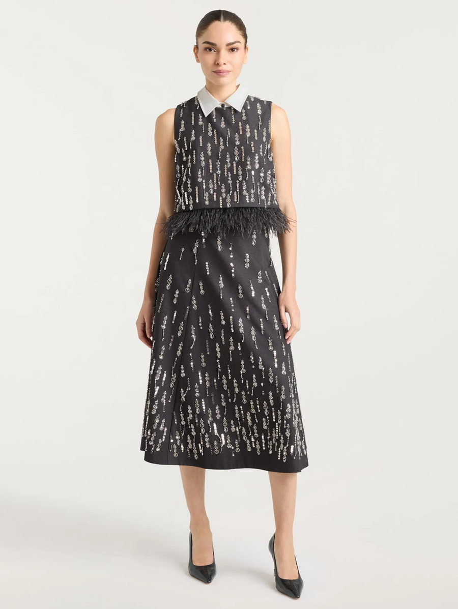 Amy Says... The Selene Skirt combines a flattering A-line midi silhouette with subtle sequin and bead detailing, adding a touch of sparkle that suits both professional and evening settings. Complete the look with the coordinating Selene Top. Shop Skirts.
