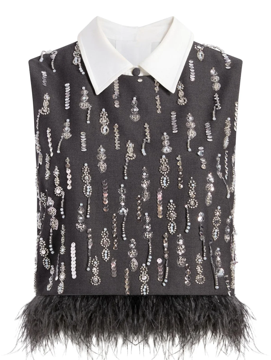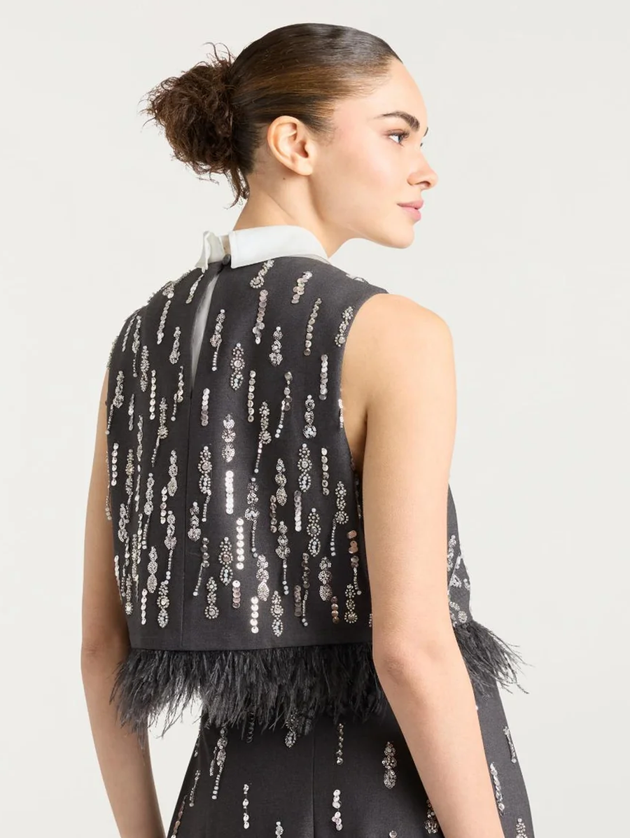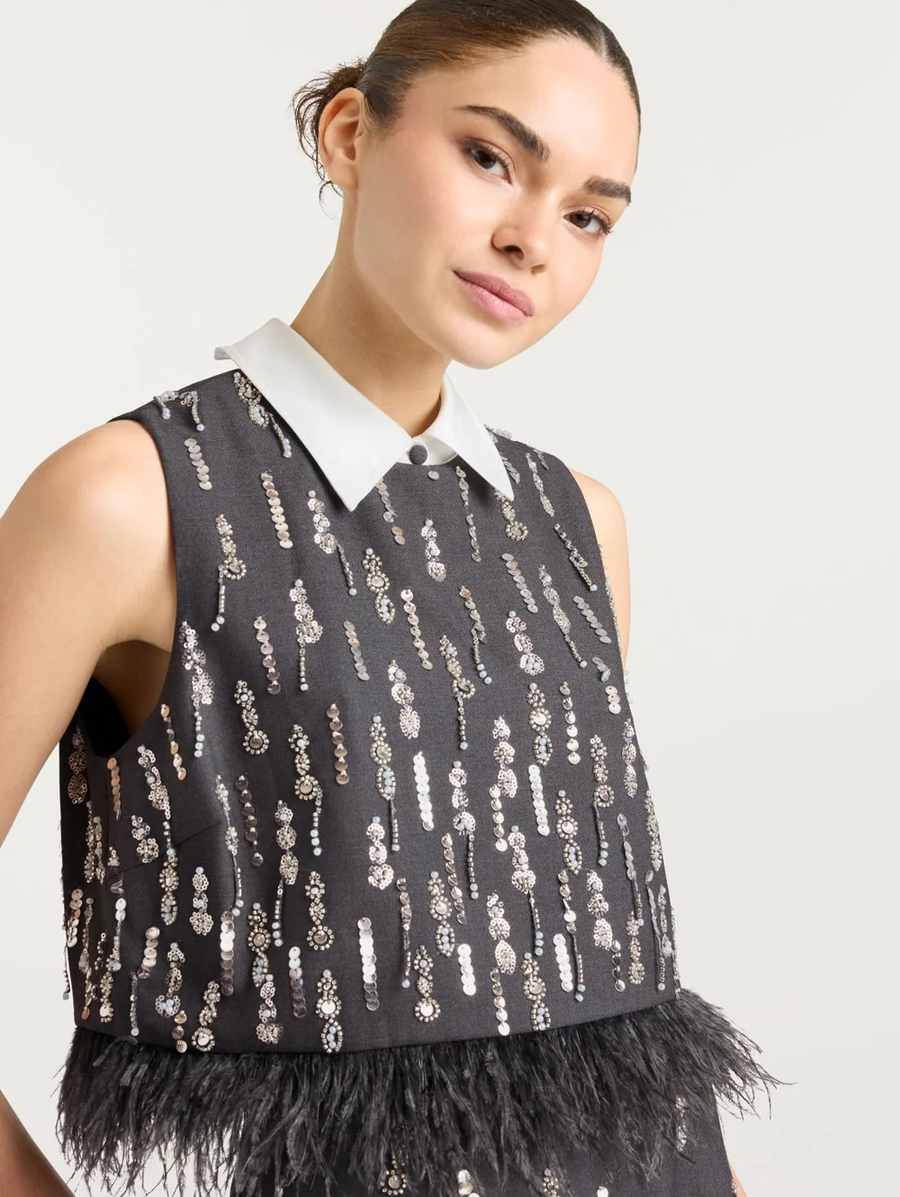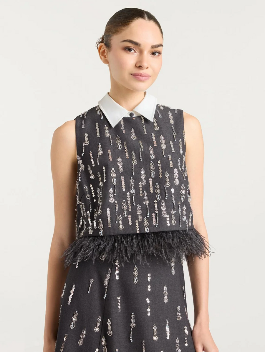 Amy Says... The Selene Top features a sleek sleeveless collar style enhanced by a feather-trimmed hem for texture and movement. Adorned with sparkling sequins and delicate beadwork, this stylish top adds a glamorous finishing touch to your ensemble. Complete the look with the coordinating Selene Midi Skirt. Shop Tops.